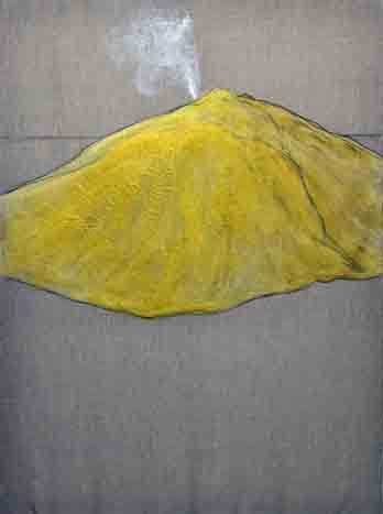 Avendo udito e visto delle piccole eruzioni, per questa mostra espone cinque tele dipinte con la cera d’api. Materiale che le evoca il colore dello zolfo, e il magma per la sua fluidità calda e rigida quando si raffredda.