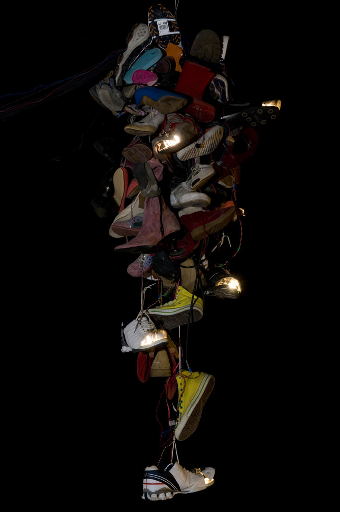 Tra i lavori in mostra Strange Fruit (2010), il cui titolo è ispirato dall’omonima canzone scritta dal compositore Abel Meerpol, testo di forte denuncia contro i linciaggi dei neri nel sud degli Stati Uniti e magistralmente interpretata dalla cantante afroamericana Bille Holiday per la prima volta nel 1939 al Café Society del Greenwich Village. Lo “strano frutto” di cui si parla nella canzone è il corpo di un nero che penzola da un albero. Allo stesso modo, nell’installazione di Farrell, vecchie scarpe pendono dall’alto come metafora di un’umanità lasciata “appesa”, ciondolante, a rappresentazione di una forte crisi sociale. Le scarpe di Strange Fruit parlano, e a dar loro voce è la versione nazista di Peter Sellers di She Loves You dei Beatles, (nella quale due perfetti soldati tedeschi si danno il cambio di guardia spartendosi i versi della canzone), una caricatura del fantasma della dittatura, di reminiscenza altresì chapliniana.