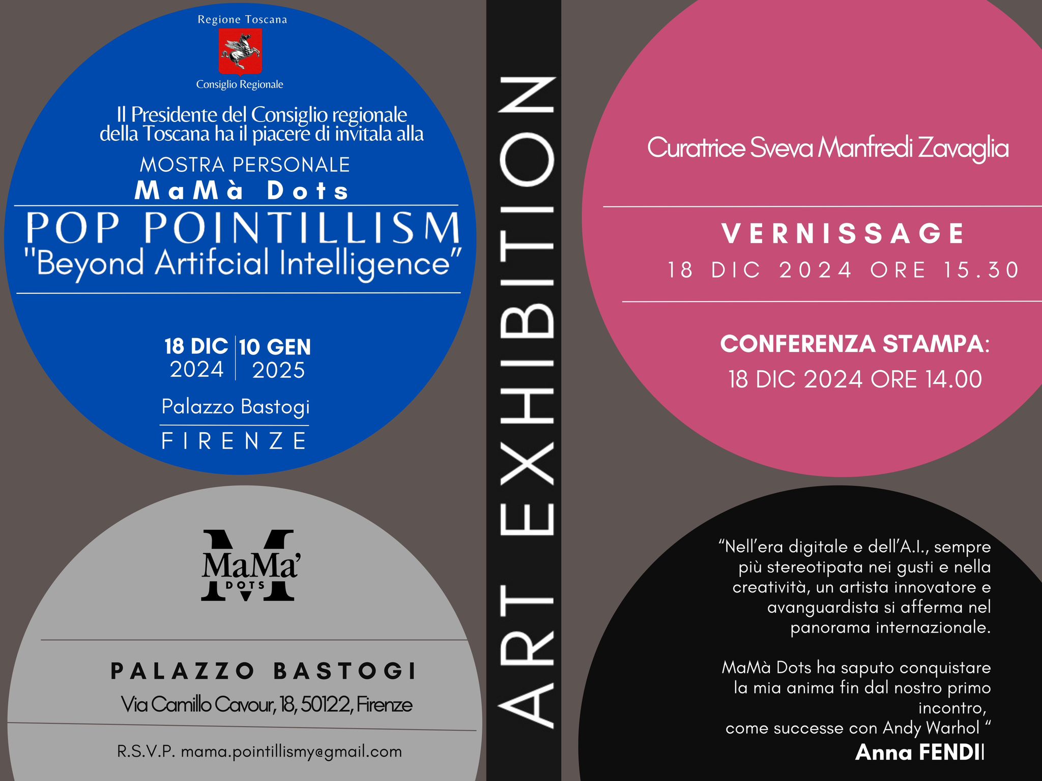 Firenze, novembre 2024 – Il Consiglio Regionale della Toscana è lieto di annunciare la mostra d’arte contemporanea "Pop Pointillism Beyond Artificial Intelligence", un evento esclusivo dedicato al collettivo artistico MaMà Dots, che si terrà presso Palazzo Bastogi, sede del Consiglio Regionale, in Via Cavour 18, Firenze.