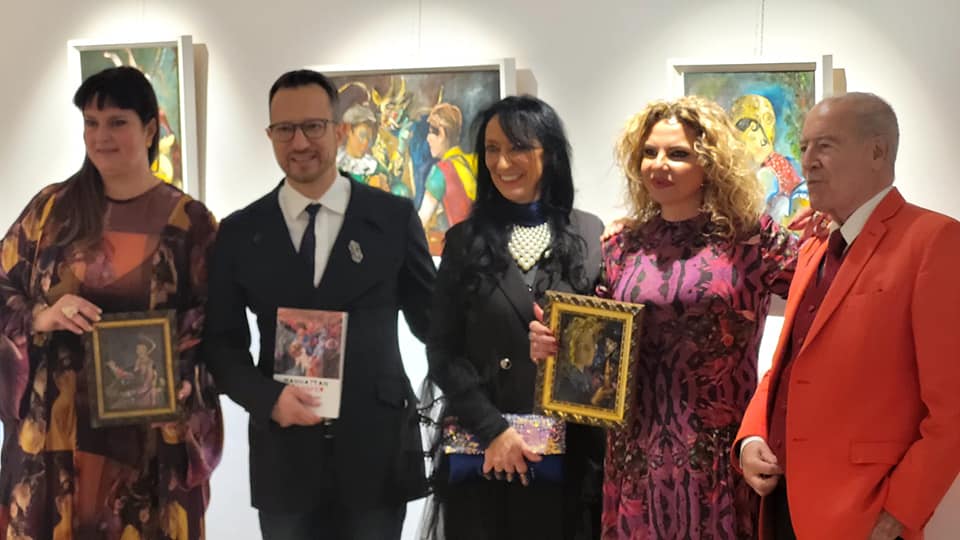 Cristoforo Russo in mostra con dodici dipinti ci confessa: «Esporre qui nel museo Venzanzo Crocetti è motivo di grosso orgoglio. Un gigante che ha attraversato l’intero ‘900 con un’energia unica: “Come posso fare per aumentare le ore del mio lavoro? – si chiedeva Crocetti – Il tempo scorre troppo veloce tra le mie mani…….a volte ho la sensazione di aver tralasciato qualcosa, come colui che uscendo di casa crede di aver dimenticato le chiavi per rientrare”. L’idea era di inserire le maschere e i costumi di Manhtattan Transfer nel contesto di Alta Moda Roma: tessuti, losanghe, colori, piume, uomini e donne in abiti suntuosi per rivivere le atmosfere carnevalesche e non solo. La moda dei balli in maschera nel XVIII secolo, a Venezia e in altre città europee erano organizzati balli in maschera in cui tutto era consentito. Quanto più una maschera era rara, tanto più veniva ammirata».