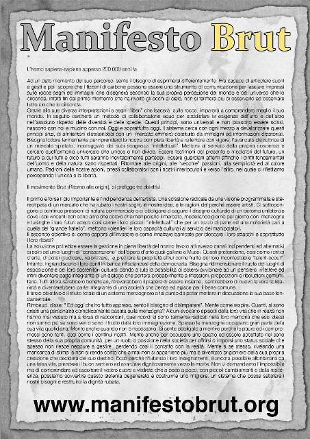 Il Manifesto Brut, si prefigge tre obiettivi, l’indipendenza e libertà dell’artista, lottare contro l’avanzata di un mercato dittatoriale, rendere gli spazi espositivi democratici, contrastare la menzogna, e privileggiare la condivisione