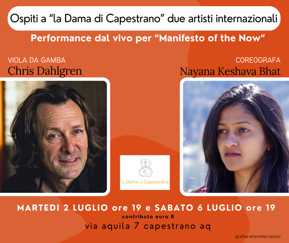 L'opera originale, composta da sette brevi assoli e cinque atti di gruppo, si svolge in quattro giorni e in diversi spazi. Ogni performance è un atto di resistenza, in cui gli interpreti, i ballerini e i musicisti negoziano tra la struttura coreografica data e lo stato imminente del corpo in relazione allo spazio e al tempo. Con temi fisici e sensoriali distinti, gli artisti in ogni atto esaminano il “qui ed ora” da un punto di vista diverso. Presso lo Spazio d’Arte Multidisciplinare de “la Dama di Capestrano” - che guarda sempre con molta attenzione all’offerta del panorama artistico internazionale - verrà proposto un estratto di questo particolare progetto. Martedì 2 luglio alle ore 18 e visitabile fino a domenica 7.07 ci sarà l’inaugurazione della mostra delle fotografie del progetto di Raphael Mittendorfer e la proiezione del film “Making of a Manifesto”, realizzato dal regista rumeno Mircea Sorin Albutiu e montato dalla stessa Nayana Keshava Bhat. Il documentario, realizzato nel 2022 nell'ambito della ricerca artistica per “Manifesto of the Now”, documenta i processi creativi di tre improvvisatori, seguendo il filo di un'idea, di un impulso e dipanando così un universo; essere autentico e trasparente.