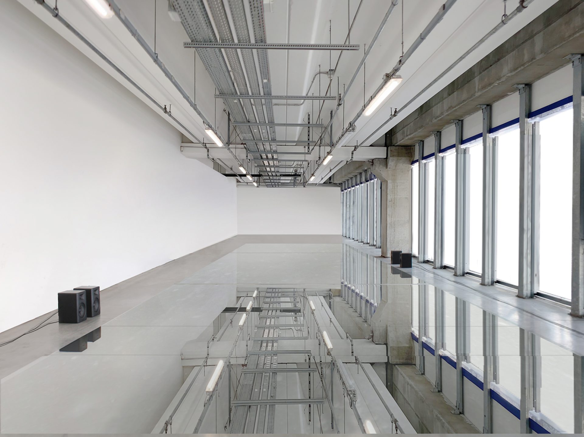 Spazio ORR is proud to present bring to the ground the fourth solo show by Manuel Fois. The large mirror surface on the ground ideally divides the space into two sections; two pairs of amplifiers spread, giving back, inside the place, the noise of the room itself. Images and sounds produced by the installation are the mirror image of a real datum, which is returned to the environment, in an increased way. Noises and images thus become an artificial synthesis, recreated and poured into the environment, as if to propose a comparison between a real vision and its copy.