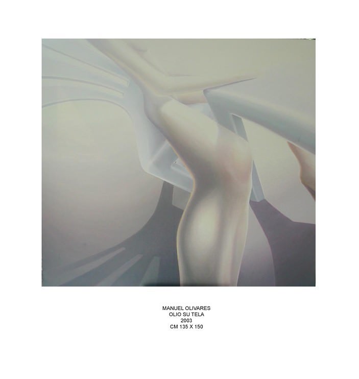 Manuel Olivares è partecipe di questa affascinante evoluzione: la sua tecnica è tradizionale, olio su tela, e lo stile è figurativo. Sulle sue opere, i critici esprimono interessanti e dotti giudizi, con richiami a illustri maestri del passato: i manieristi, Escher, Dalì…certamente, Olivares, pur estraneo alle accademie d’arte, non è immune da suggestioni o “simpatie” artistiche. Sono affinità culturali di una ricerca espressiva, in cui lo sguardo dell’artista si volge al mare delle immagini in cui siamo immersi e che mutano e alterano la nostra sensibilità visiva. Un alterazione che, banalmente, spesso ci fa paragonare un bel paesaggio a una cartolina, capovolgendo il rapporto tra reale e artificiale, tra modello e rappresentazione. Le immagini di Olivares presentano inquadrature inconsuete, di taglio cinematografico, dove le linee sinuose e le tonalità cromatiche suscitano sensazioni stranianti, quasi un ingresso in un mondo parallelo. Un mondo fantastico? Forse, ma creato da un diverso “punto di vista” che, all’improvviso, ferma un fotogramma del film che scorre davanti ai nostri occhi. Olivares lascia l’interpretazione alla sensibilità di chi guarda.