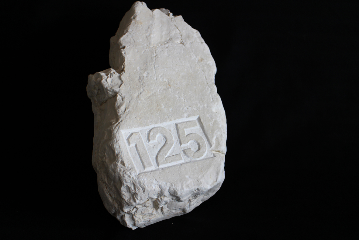 Poco più in là una «Pietra numeraria» di Tiziano Bellomi, un sasso delle vicine cave veronesi, offre uno spiazzante concetto di scultura. Sopra la pietra l’artista ha scolpito, con impegno michelangiolesco, un numero in caratteri arabi: «130». L'iscrizione scultorea a bassorilievo occupa uno spazio esiguo se rapportato alla dimensione della massa rocciosa. Siamo davanti a una micro catalogazione: è l’enunciazione del progetto per cui l’intera Villa Ippoliti viene definita come opera d’arte. La pietra numerata è la traccia ideale di una azione concettuale semplice e ponderata, che rimanda a tutti i precedenti tentativi dell’autore di scoprire, ridisegnare il mondo e di appropriarsene.
