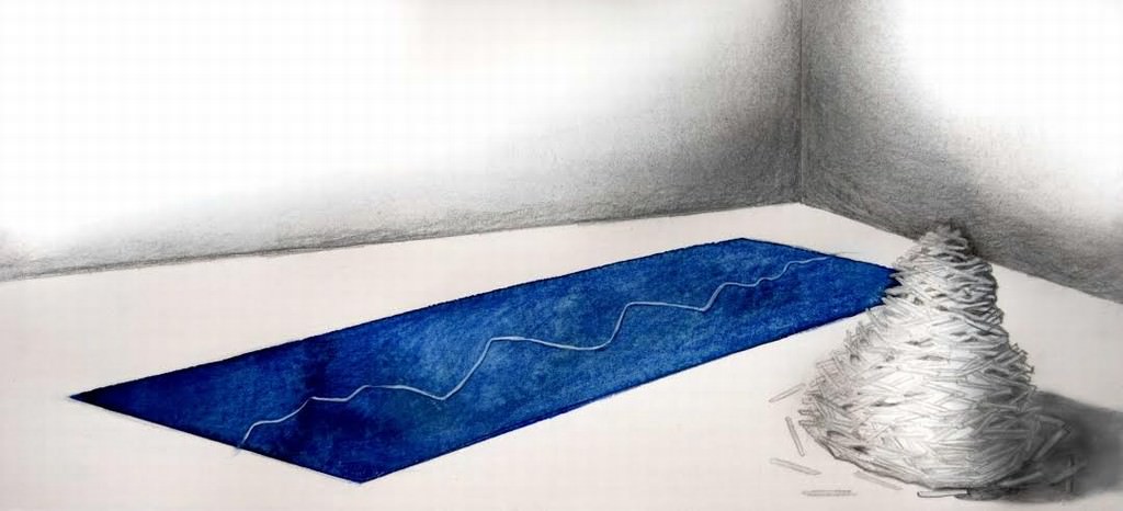 Una lunga striscia di seta blu, come il cielo e come il mare che si specchiano, che diventano una cosa sola con la terra, su cui ricamerà in scala la linea della cresta appenninica, simbolo dell’unione dei due continenti. Le numerose e continue morti in mare, che coinvolgono i migranti nel Mediterraneo, aprono a una riflessione sulla separazione e l’avvicinamento di due terre solo apparentemente lontane. L’artista invita ad una azione condivisa che andrà crescendo nel corso dei mesi, coinvolgendo abitanti del luogo e turisti, attraverso l’accumulo di legnetti di 10 cm cad., che rappresentano in scala 1:10 l’unità di misura del metro lineare. Vorrebbe chiedere a ogni visitatore di portare un legnetto per partecipare all’installazione e riuscire, con il tempo, a raggiungere il numero delle vittime del mare, 23.598 (cifra aggiornata all’anno 2014 e purtroppo ancora in crescita)