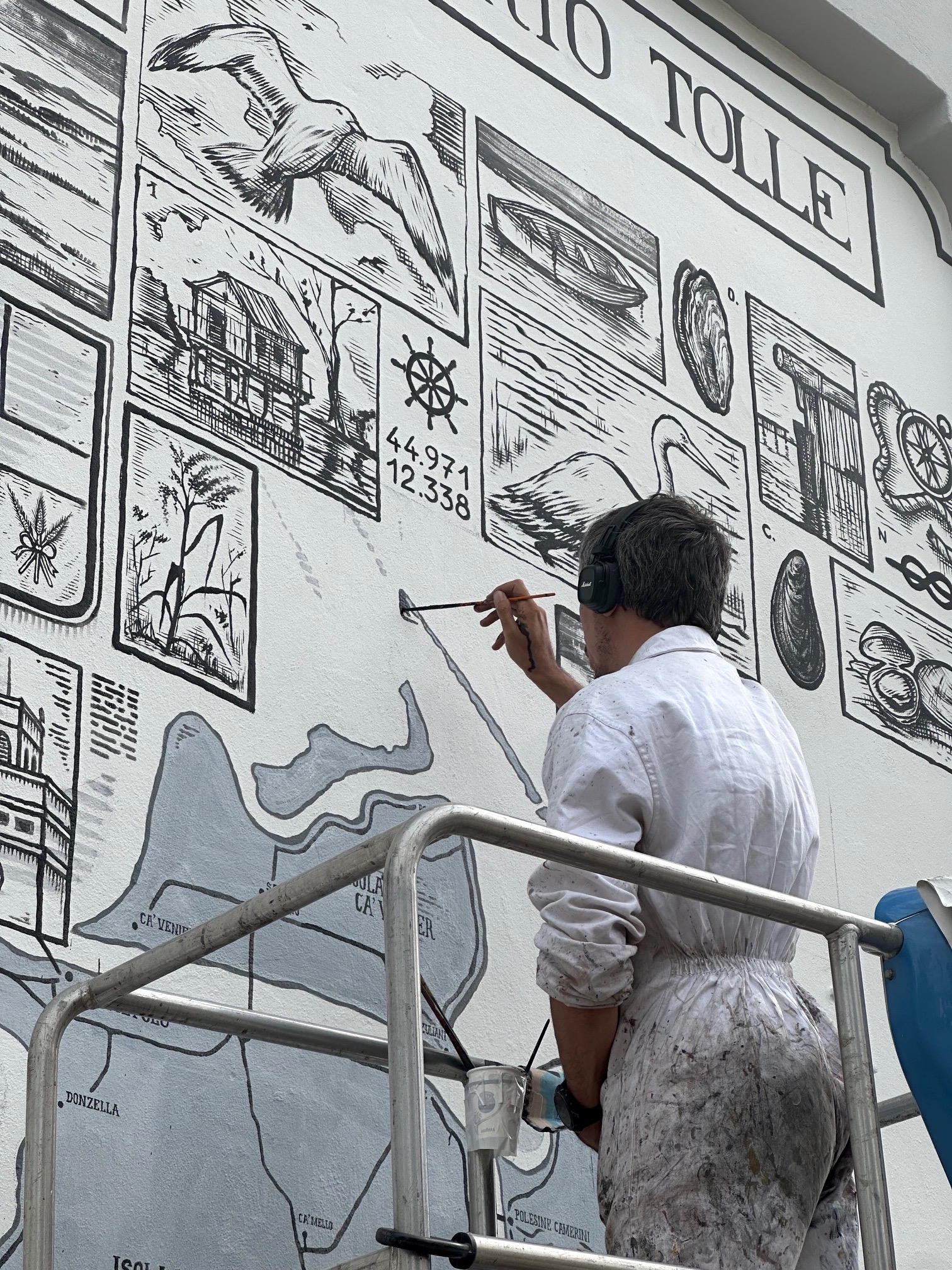 I primi giorni sono stati dedicati allo studio del territorio e al confronto con il gruppo di lavoro, al fine di mettere a fuoco il bozzetto. L’artista ha partecipato ad esempio a un’escursione in barca sul Po di Maistra, in cui ha potuto osservare le particolarità del fiume e del suo delta. Si è inoltre confrontato con la popolazione locale e ha chiesto di suggerirgli cosa rappresentare. In molti hanno risposto con entusiasmo e coinvolgimento, in un fitto dialogo carico di spunti di riflessione.
