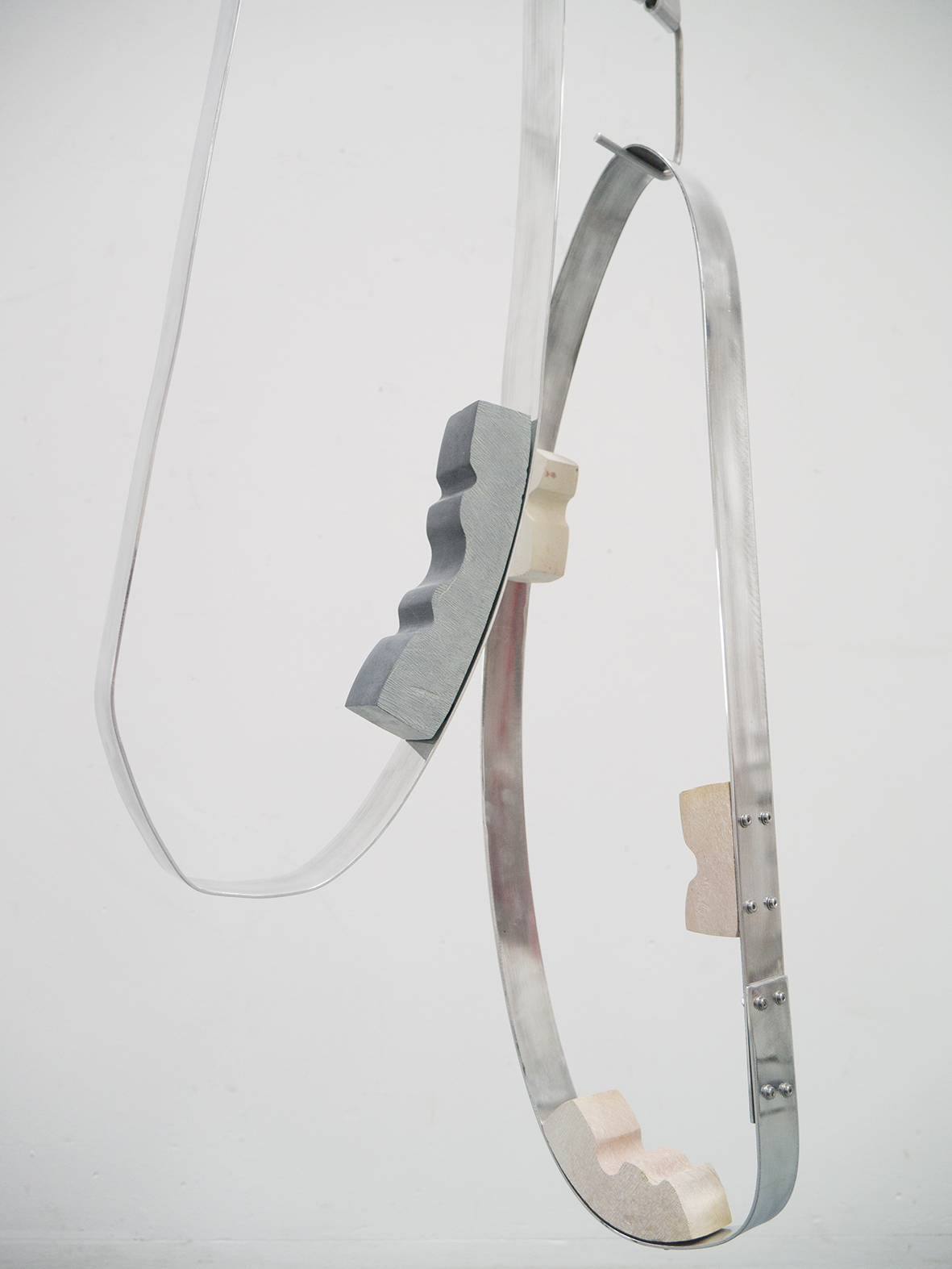 Lisa Sebestikova (Enschede, NL, 1988) alla sua prima mostra in Italia, ha concepito i lavori esposti dopo la sua prima visita a Roma. Il risultato è nato dal confronto fra la storia umana ed architettonica della città e la sua pratica artistica basata sull’analisi del paesaggio e dei suoi elementi iconici, poi sulla loro cancellazione. Da questa necessità e dalla fascinazione per la pietra, materia prima su cui è fondata la città di Roma, nascono le opere sculturee presentate nella mostra. Strutture di alluminio sospese contengono dei frammenti di pietra saponaria. Queste forme fluttuanti sono una reminiscenza delle armature che cingono le parti più fragili dei monumenti e raccontano la storia di ciò che hanno contenuto attraverso la silhouette impressa nei frammenti di roccia. La Sebestikova stravolge queste strutture privandole del loro scopo di trazione e contenimento, trasformandone la natura: l’armatura diventa un corpo molle e ciò che è nato per sostenere diventa a sua volta mobile e fragile. Tutte le sculture sono pensate per essere dinamiche come dei Mobiles di Calder e per non avere una forma definitiva; lasciano aperta la possibilità di essere modificati e ri-assemblati come diari aperti di infinite storie.