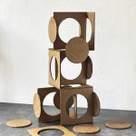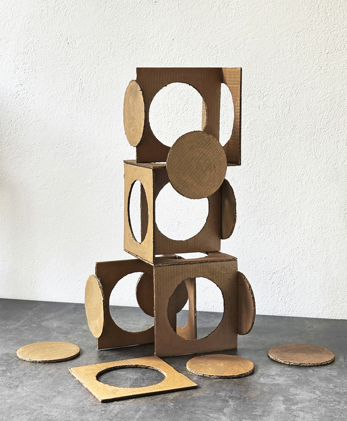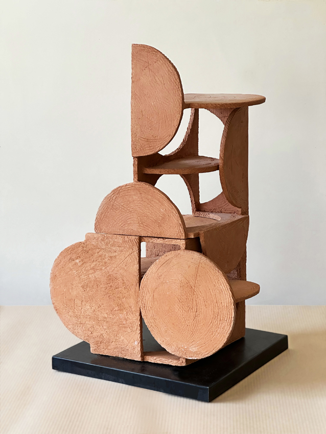 Per un certo tempo van Wees dipinge, attratta dal colore delle composizioni geometriche con cui Vasarely conquista lo spazio. Come aveva fatto il suo maestro, porta l’arte fuori dai luoghi deputati, collaborando con il Teatro della Lanterna, un collettivo sperimentale di teatro in strada. Queste esperienze sono fondamentali per quanto riguarda il passaggio alla dimensione spaziale e quella del paesaggio, trovato in Italia. Qui van Wees si dedica alla ceramica, intesa non come utensile artistico ma piuttosto di opere uniche, nella maggiore parte dei casi con un significato correlato ai luoghi e al paesaggio. E infatti già dopo i primi vasi di argilla refrattaria lo stesso materiale gradualmente diventa scultura, torre, superficie all’aperto, a volte amalgamata ad altro materiale; così è Tris (2024), una torre che rimanda al gioco di composizione con argilla, metallo e legno, volutamente grezza nel suo essere opera primitiva e arcaica, che fa da contrappunto a Open House (2021) - titolo da una canzone di Lou Reed e John Cale - una delicata scultura di argilla che ha diverse prospettive esterne e interne, una casa aperta che si può guardare come si vuole, immaginandosi dentro o fuori. Nell’allestimento in galleria, On the Road (2024), la maquette a dimensioni naturali in cartone trattato, elemento centrale è il cerchio, che viene riprodotto più volte partendo dalla tridimensionalità di un dima degli oblò, sempre pensando allo spazio e all’abitabilità, in un processo ideale di elementi proliferanti, come nella frase ripresa da Jack Kerouac: “You can go always further, further … you never finish.”