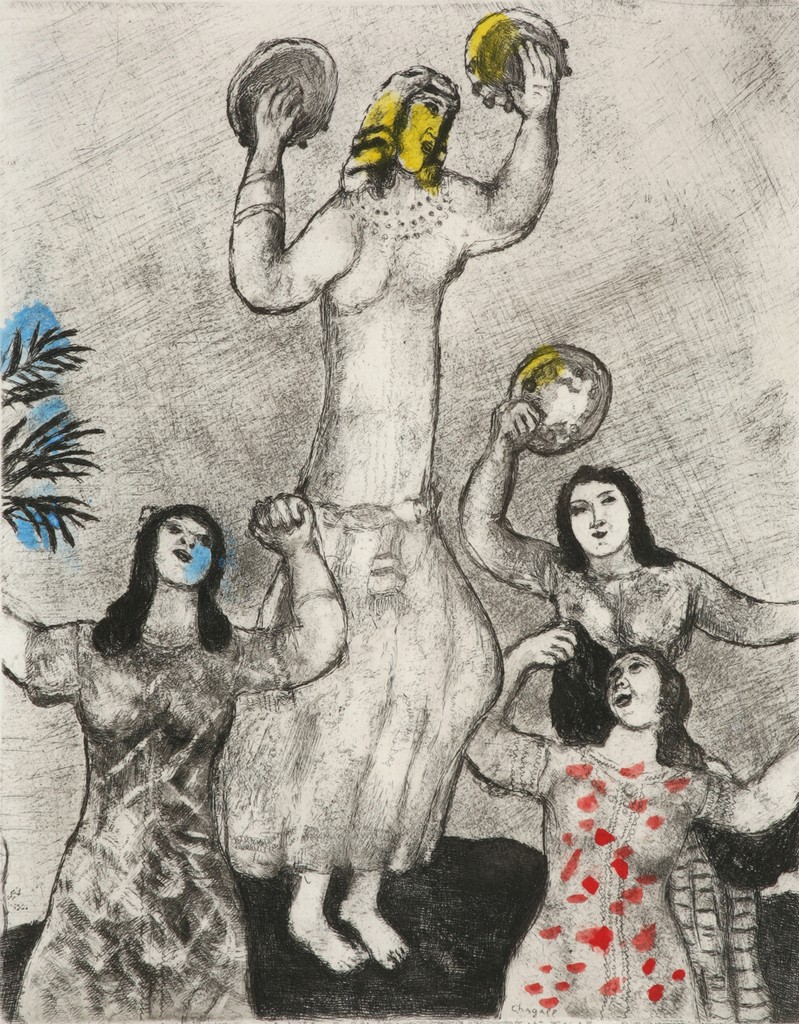 Vollard commissionò a Chagall l’illustrazione della “Bibbia”. Dopo un viaggio in Palestina e dopo aver realizzato una serie di gouaches preparatorie l’artista iniziò l’incisione delle centocinque tavole che compongono l’opera. Quando Vollard morì accidentalmente nel 1929, 66 tavole erano state terminate, le 39 tavole restanti, appena abbozzate, saranno riprese al suo rientro in Francia, nel 1952, dopo il periodo trascorso negli Stati Uniti, dove era riparato per sfuggire alle persecuzioni antiebraiche: saranno pubblicate nel 1956 dall’editore Teriade che le aveva acquistate dagli eredi di Vollard. Alcune di queste opere anche acquerellate a mano dall’artista sono esposte in mostra.