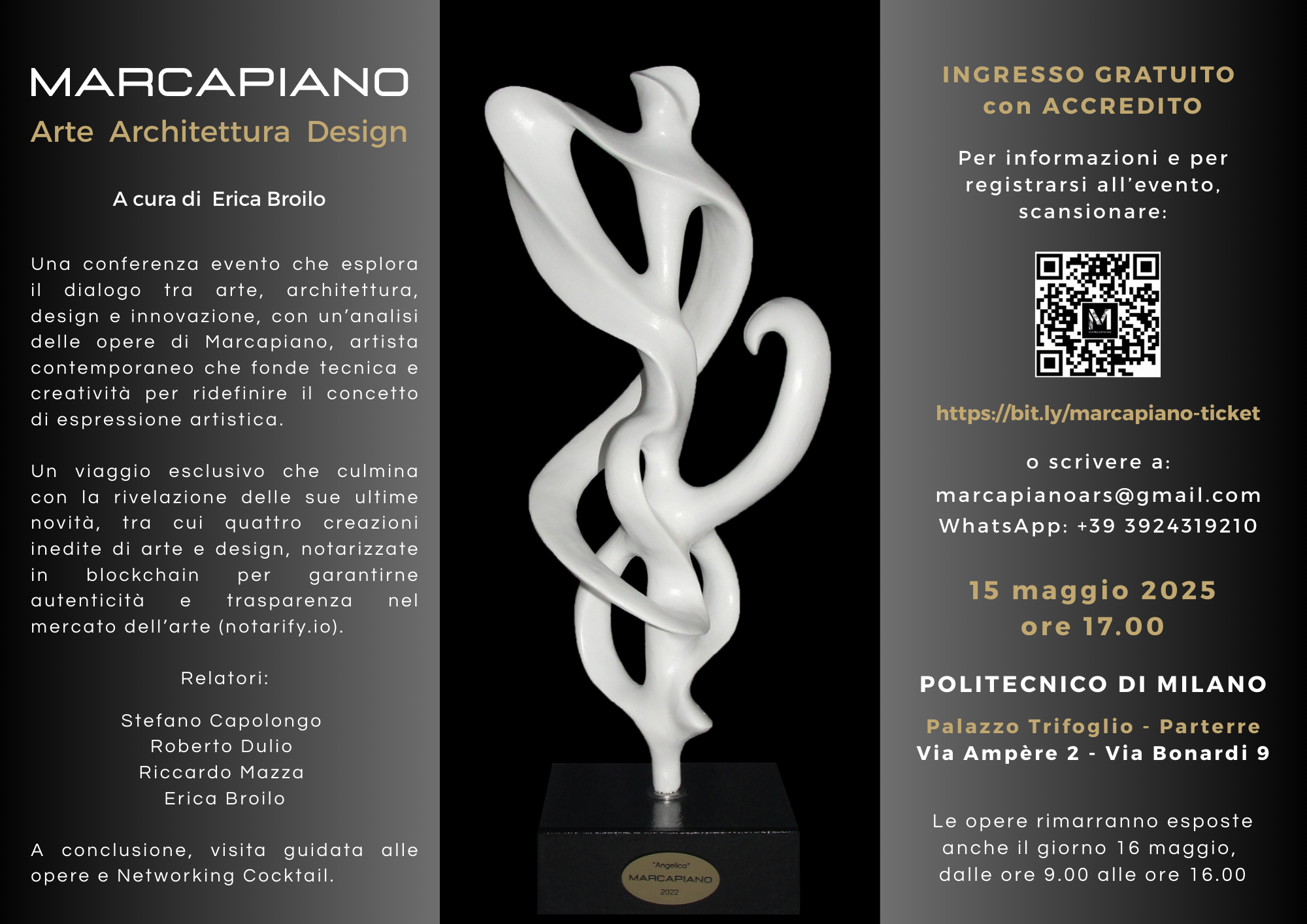 Nascono da qui le inedite e originali creazioni di arte e design di Marcapiano, presentate per la prima volta in questa occasione al Politecnico di Milano, che rappresentano una fusione armonica di arte, architettura, design ed ingegneria.