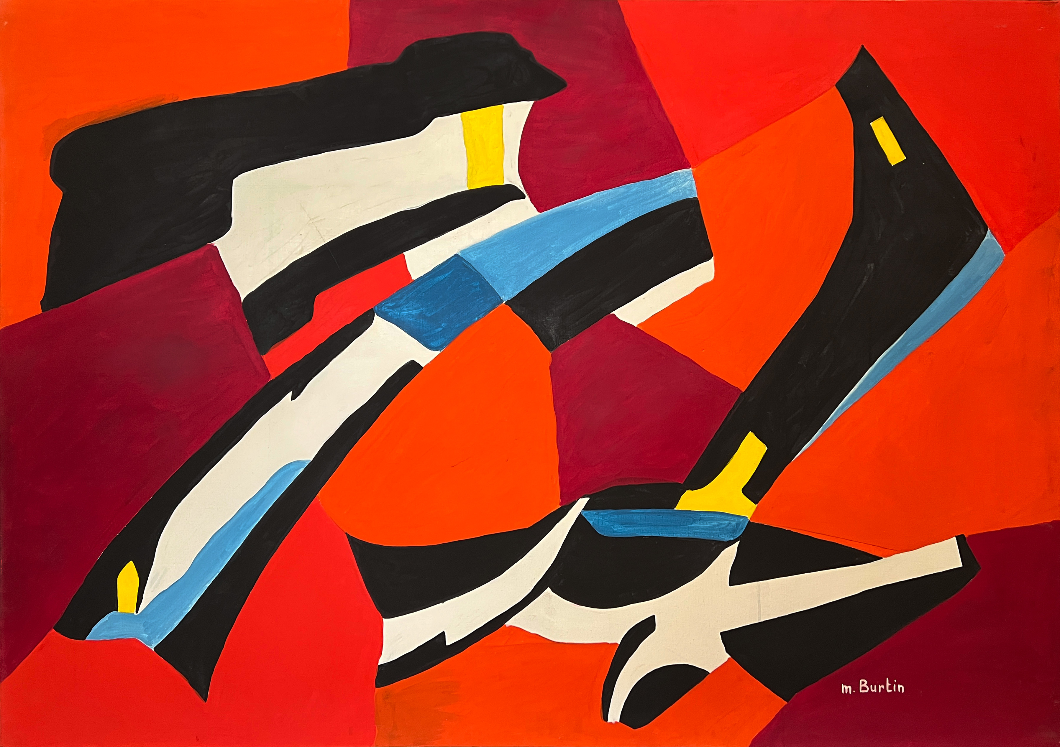 Il colore è l’elemento chiave nell’astrattismo di Burtin; un viaggio attraverso il mondo di cromatismi fatti di ritmi e contrasti. Da queste tele emergono i rossi, i blu, il giallo zafferano, colori che si oppongono ma si attraggono e che raggiungono nell’insieme una perfezione scintillante e luminosa, che rappresenta la sua arte vigorosa ed equilibrata, dalla quale emerge la gioia di vivere.