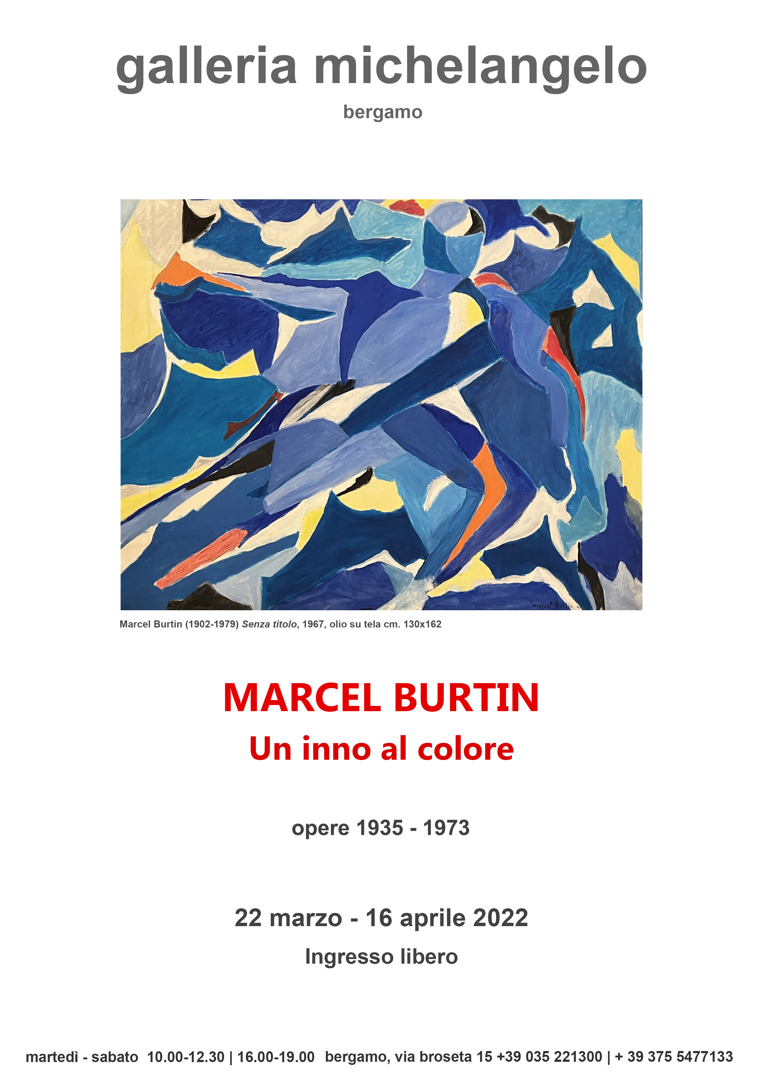 E’ un inno al colore la mostra che la galleria michelangelo organizza per rendere omaggio all’artista Marcel Burtin (Gafsa, Tunisia, 1902, Boulogne-Billancourt, 1979). In mostra sono presenti opere di grandi dimensioni, astratte, dinamiche e colorate; composizioni dove l’artista esprime la gioia di dipingere di fronte alla quale non si resta insensibili. L’artista dà prova di essere in grado di giustificare il formato delle sue tele senza rischiare di cadere nel decorativo e di raggiungere una sintesi plastica dove il motivo è svanito e tutto il superfluo è sommerso, allontanato.