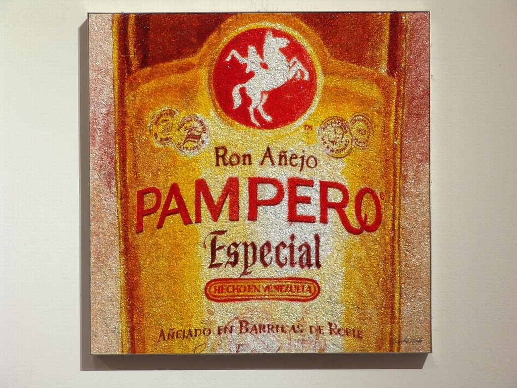 Etichette esplose su superfici riflettenti montate su faesite. La tecnica mista corrompe il bianco dello spazio per rubarne la materia, sostanza aleatoria smarrita in una illusione di concretezza. Quasi un brindisi beffardo all’inafferrabile produzione di una società confezionata nell’ingenuità dell’apparire.