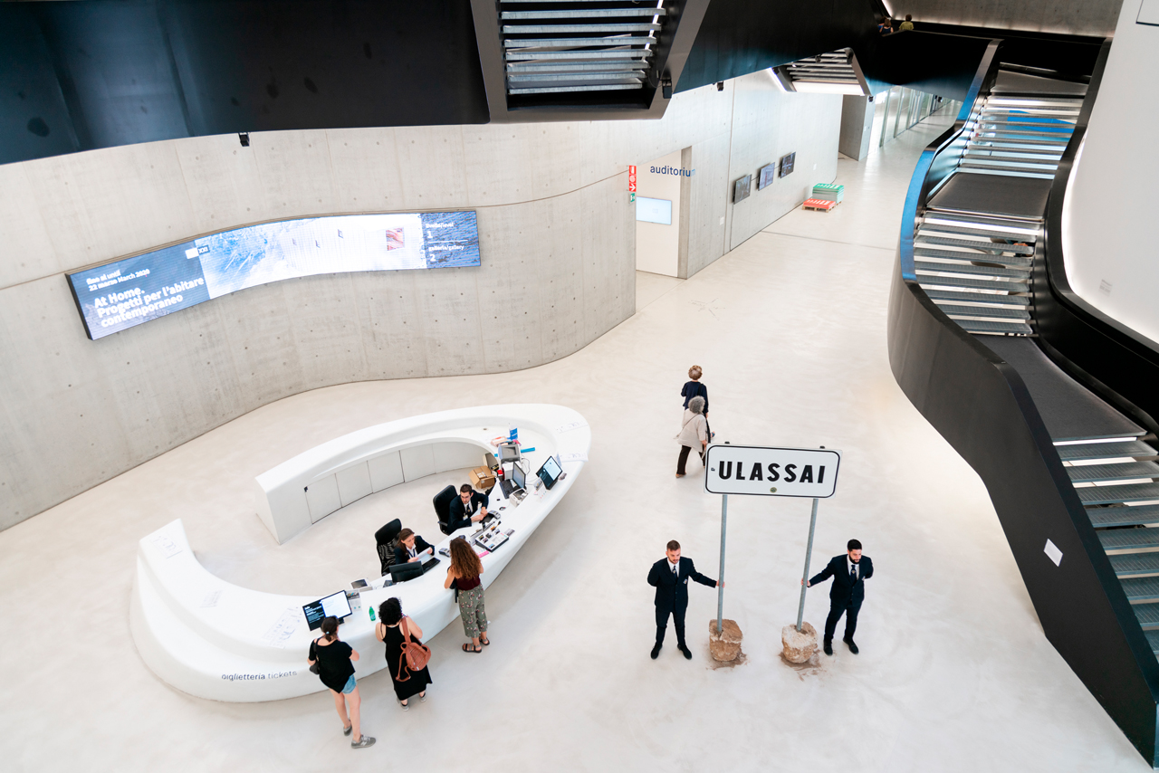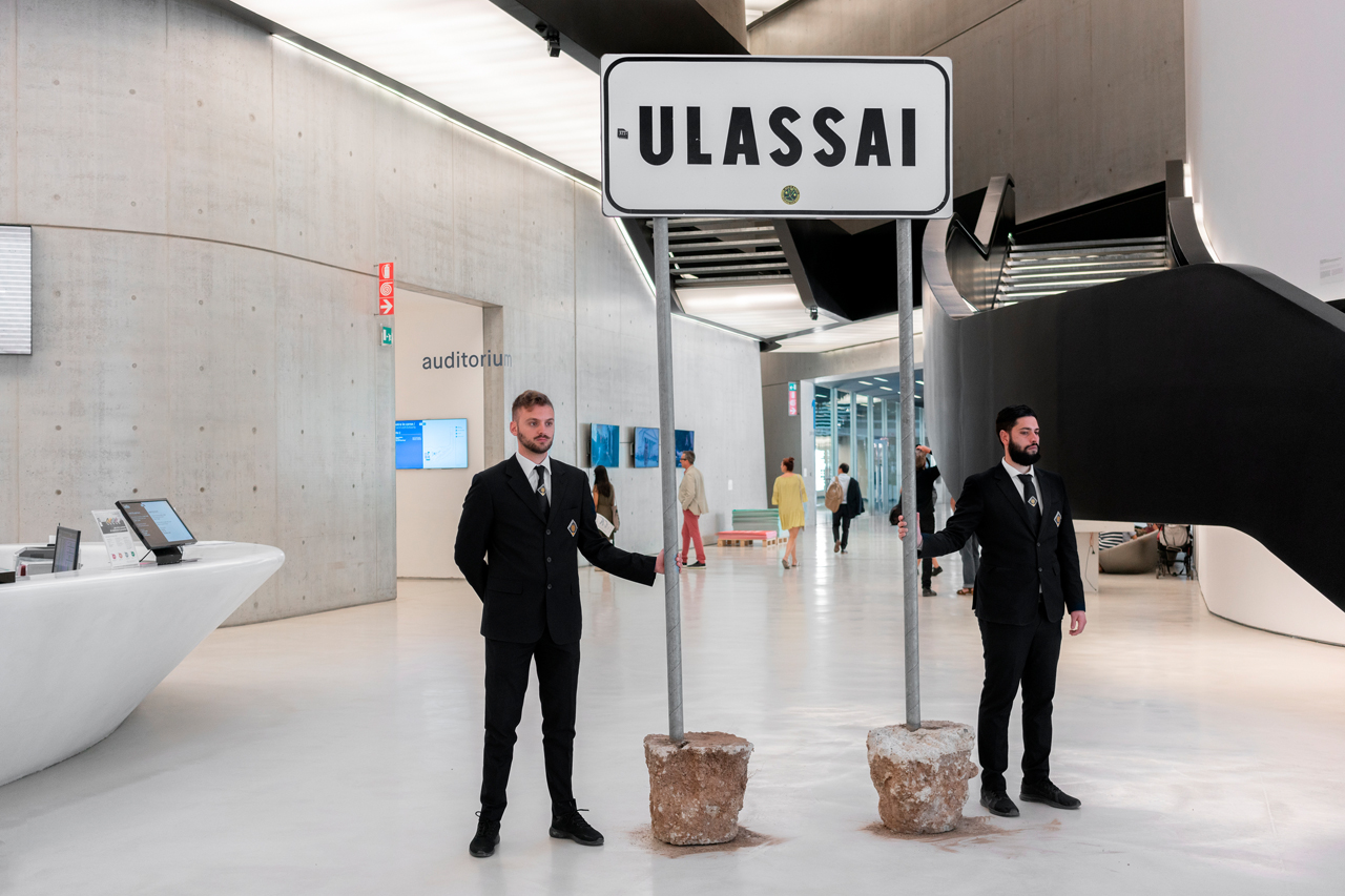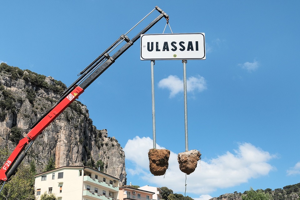 L’ANTEPRIMA: ULASSAI A ROMA - Il progetto è stato preceduto da un’anteprima che si è tenuta tra il 18 e il 19 giugno presso il Museo MAXXI di Roma, in occasione dell’inaugurazione della mostra che il Museo Nazionale delle Arti del XXI secolo ha dedicato a Maria Lai. Le due giornate hanno visto la presenza, all’entrata del museo, di due addetti alla sicurezza intenti a sorreggere il cartello stradale di Ulassai. Ad accogliere i visitatori è stata dunque una “scultura vivente” che, grazie a una serie di rimandi e riferimenti concettuali, ha dato vita a una vera e propria “sbandata geografica”. Attraverso il cartello stradale, Marcello Maloberti ha collegato idealmente due luoghi distanti ma emblematici della biografia e del percorso di Maria Lai: Ulassai e Roma.