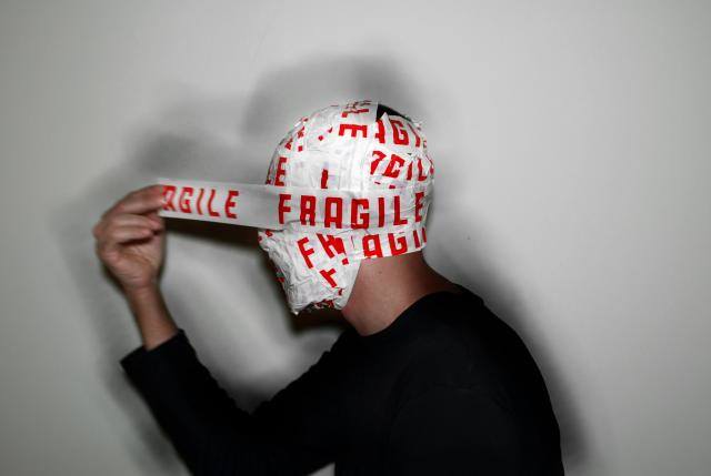 Una forma di protezione autocostruita, la testa tutelata da attacchi fisici, o forse da quello che non riesce a proteggere il cuore. La paura di sconvolgimenti, il non sentire i tradimenti, l’amore o l’ipocondria, l’angoscia di farsi male, e comunque soffrire, per poi alla fine liberarsi di tutte le sovrastrutture per sgomberare la mente. Coinvolgente, questa è la prima cosa che ho pensato nel vedere le foto; la fragilità della nostra esistenza, l’artista non ha paura di mostrarla anzi mette in evidenza le mani che compiono un gesto importante, che decidono comunque di agire svelando, poi alla fine, una nube nera informe.