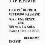 Nel corso della sua formazione artistica, Marcello Mantegazza ha sempre avuto un’intenzione persistente e costante nei confronti delle catalogazioni, degli inventari, degli elenchi, delle numerazioni e dei codici. La storia, l’arte e la letteratura sono insite nel suo background culturale e la parola è il suo grande motore di ricerca. Dentro questa sua visione, l’artista ha trascritto alcuni versi della Divina Commedia che riguardano il territorio viterbese, utilizzando come mezzo di scrittura il timbro: modalità, questa, che fa parte del suo percorso alla puntuale ricerca delle parole da non dimenticare. Frammenti impressi con l’inchiostro, versi timbrati che fanno parte di un unico grande archivio artistico della storia della scrittura letteraria.