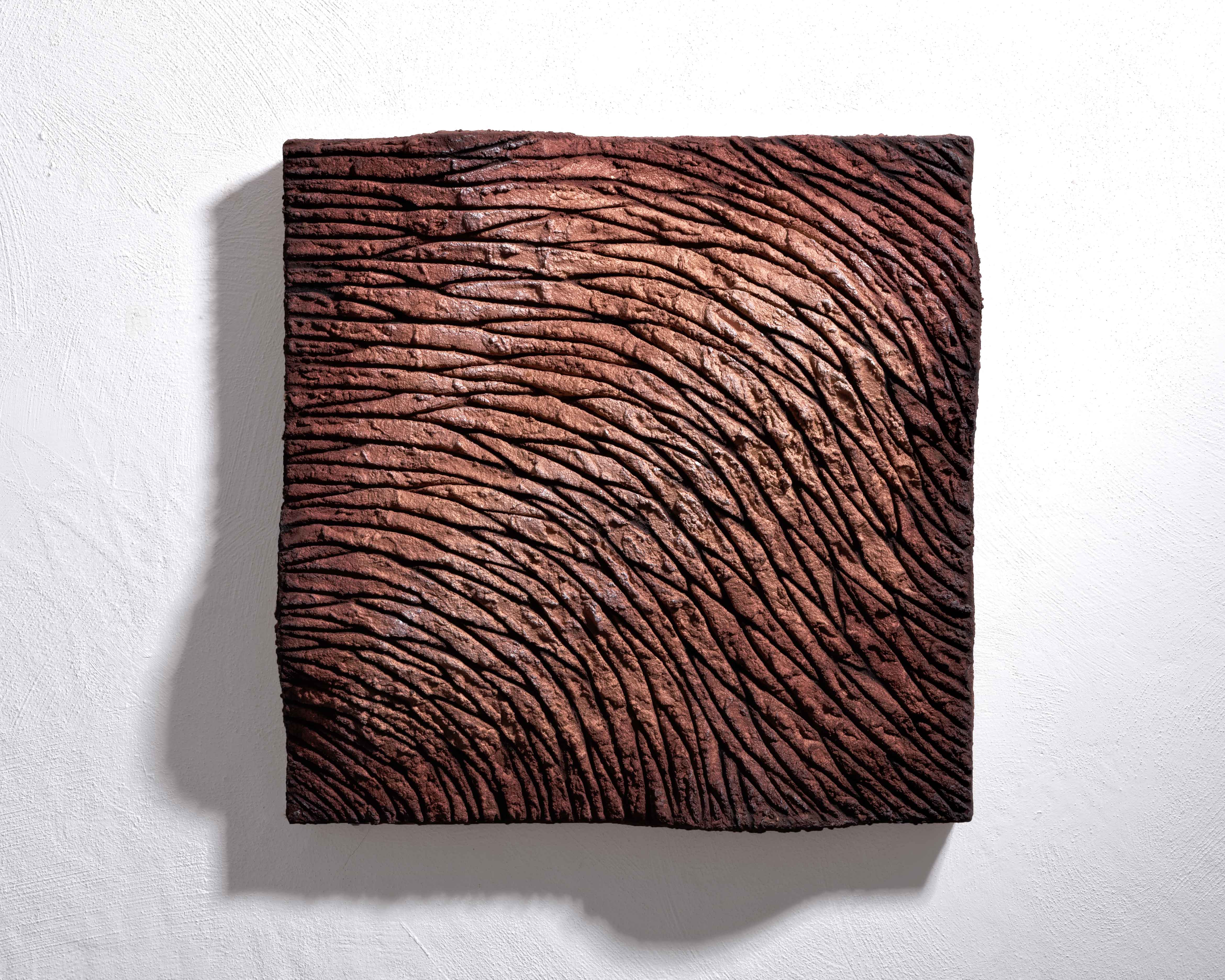 Marco Abbamondi – classe 1974 – ha basato la sua personale ricerca stilistica sul rapporto con la natura nel senso più profondo. Non si limita infatti a celebrarla in modo convenzionale e accademico, bensì sottolineandone la fragilità e al tempo stesso il potenziale espressivo e formale che le sue materie prime possono offrire. Le sue composizioni – a metà tra quadri e sculture – sono il frutto di un connubio volutamente antitetico: una base in cemento, elemento grezzo ma di grande utilità per l’uomo, e una selezione di pregiatissimi pigmenti provenienti da più parti del mondo estratti dalla terra. Il risultato è un lavoro unico in quanto irripetibile e mai seriale: infatti, sebbene i colori utilizzati siano spesso ripetuti, la loro intensità varia in base a fattori esterni non prevedibili i quali contribuiscono attivamente, così come l’azione dell’artista, alla realizzazione dell’opera. La contrapposizione continua quando, una volta fusi tutti gli elementi, la pasta cementizia viene lacerata e rimodellata così da creare delle ferite, ridimensionandone il ruolo difensivo e strutturale a cui generalmente il cemento è associato, ed enfatizzandone al contempo la fragilità. La condizione di continuo movimento propria dell’essenza naturale, viene in ultima fase bloccata nel suo moto in una cornice quadrata per rivelarsi all’uomo in tutta la sua realtà fenomenica.