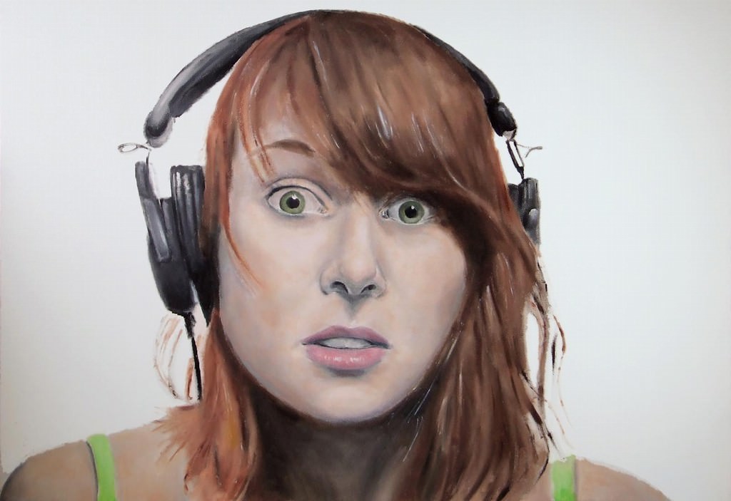 Per un bisogno di maggiore realtà delle sue eroine, l’artista ha iniziato a cercare nuovi volti ed espressioni nelle foto che a migliaia le persone lasciano su internet – mai per le strade, nella vita vera, come se Marco avesse bisogno di uno schermo che filtri la liquidità del reale e ne trattenga il nucleo compatto. Dal mondo virtuale, ormai ‘vero più del vero’, emergono le sue donne più intense, dotate di una vivacità e un’ansia di vita che davvero le accomuna alle donne verdi di Lautrec nelle espressioni, nei gesti, nei colori simbolici. Vedi, ad esempio, ‘Felicità in bottiglia’: la ragazza dai capelli rosso fuoco, con la bocca spalancata come a ingoiare la vita, i lineamenti stravolti, la bottiglia verde-assenzio, il colore acido dell’oblio. In ‘Adolescenza verde’, invece, il colore sottolinea l’aspra acerbità di un’età difficile, l’espressione attonita e spaurita, le mani tra i capelli esprimono icasticamente l’ansia di un futuro incerto e sconosciuto. Il profilo blu della malinconica ‘Notte della mia memoria’ evoca mille immagini dietro gli occhi socchiusi della diafana fanciulla assorta.