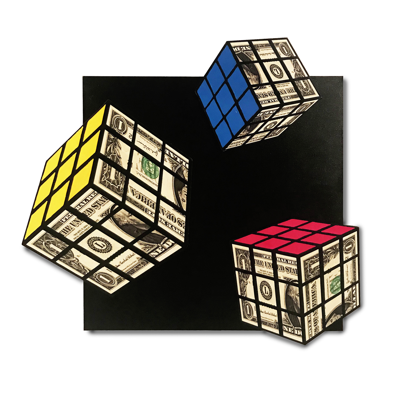La mostra presenta icone di ieri e di oggi; accanto ai soggetti pop per eccellenza: il dollaro, Marilyn Monroe, lo Chanel N.5, Michey Mouse, la Regina Elisabetta, Monnalisa - e ancora - le bandiere americane, Bettini presenta un corpus di opere in cui il comune denominatore è il cubo di Rubik, il twisty puzzle 3D, divenuto un simbolo degli anni Ottanta, tornato in auge in tempi recenti al punto da essere considerato forse il giocattolo più venduto della storia. Il cubo “magico” viene rivisitato da Bettini che lo riveste di dollari, un rompicapo del quale occorre trovare la soluzione. Il denaro, simboleggiato dal dollaro americano, affascina profondamente Bettini, non solo per l’effetto che ha sulla personalità di chi lo possiede o meno, ma anche dal punto di vista puramente estetico, “il dollaro – afferma - è un’opera d’arte in sé”.
