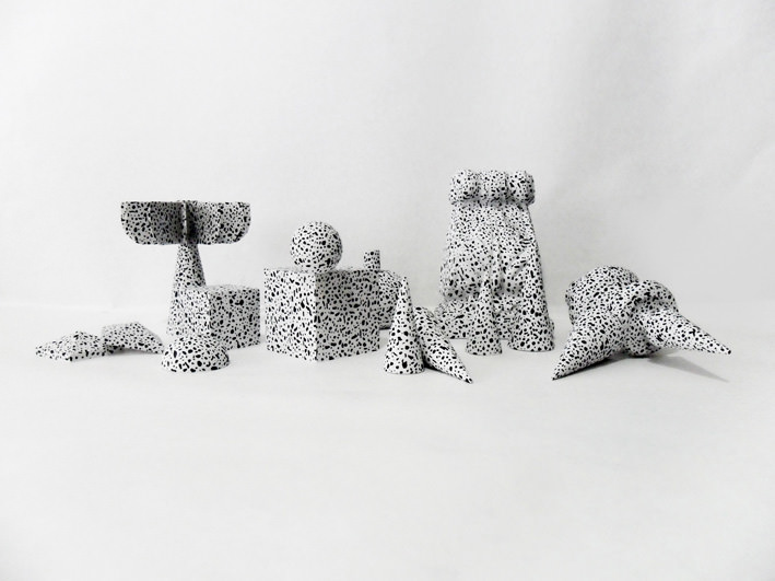 A partire da questa riflessione, Marco utilizza gli strumenti del bricolage per ricreare quello che un tempo veniva fatto a mano: lo spazio centrale della galleria ospita 3 sculture dal titolo Ruins, realizzate con materiali di recupero, come il polistirolo degli imballaggi dei prodotti di design o di informatica. Accanto ad esse una installazione costituita da alcuni oggetti-simbolo della società contemporanea legati al mondo dell’hobbistica. Forme geometriche molto semplici, ad esempio delle sfere in polistirolo bianche o verniciate acquistate nei comuni centri commerciali e sulle quali l’artista è intervenuto manualmente con tecniche dei giorni nostri.
