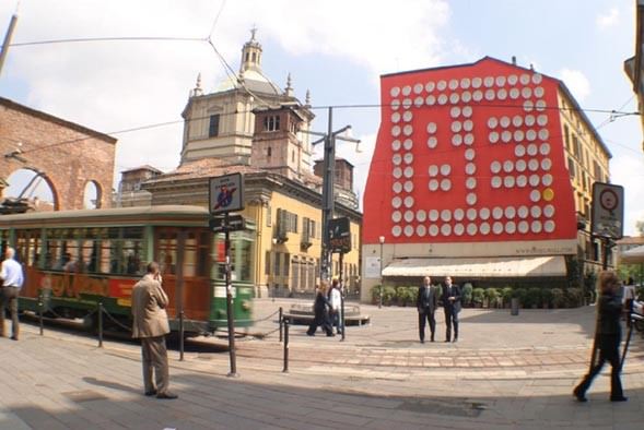 Marco Burzoni ha progettato una grande scritta composta da due lettere, BE., che in inglese significa essere, costituita da 108 grigie parabole satellitari piu’ una di colore giallo
