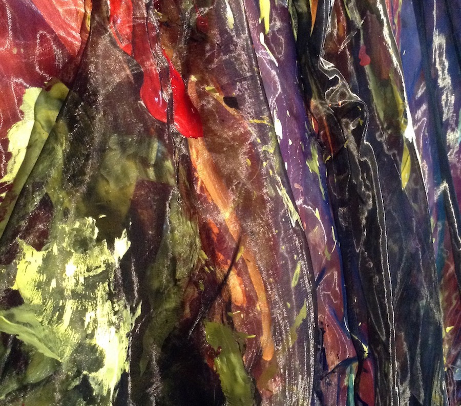 La compresenza di colori, ardita ed equilibrata, si riflette nelle due componenti principali dell’opera: la pittura e l’organza. L’organza vela i dipinti di un intellettualismo particolare, che nasce dall’importanza straordinaria che l’artista dà alla base teorica della sua opera, ma li rende allo stesso tempo materici, come se il quadro uscisse dal suo spazio fisico per invadere l’ambiente. Gli strati di colore spessi, texturizzati, pesanti e incisivi si stagliano sopra - o attraverso - leggerissimi e trasparenti strati di organza che, grazie all’aria che la muove o la luce che crea riflessi sulla superficie, dona un movimento quasi fisico all’opera, che ondeggia e interagisce con le emozioni dello spettatore.