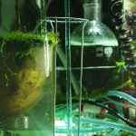 peculiare capacità della natura di riempire gli spazi vuoti lasciati, e tralasciati, dagli interventi antropici. Il processo di mutazione di questo ecosistema è agevolato dell’intervento dei due artisti attraverso un sistema idrico in grado di mantenerlo in attività, esplorando in questo modo le possibili vie di una compartecipazione tra artificiale e organico. L’acqua compare nel suo stato liquido e gassoso influendo sulla crescita della vegetazione, la quale si sviluppa adattandosi alle condizioni ambientali. Gli elementi naturali presenti all’interno dell’installazione Forma Sinteresi crescono in ambienti con un elevato tasso di umidità, ricreato all’interno dell’ecosistema biotecnologico attraverso meccanismi di vaporizzazione e irrigazione. Questi elementi sono specie autoctone delle zone limitrofe della città, compaiono infatti differenti tipologie di muschio e piccole felci che variano in base alla conformazione fisica e atmosferica circostante.