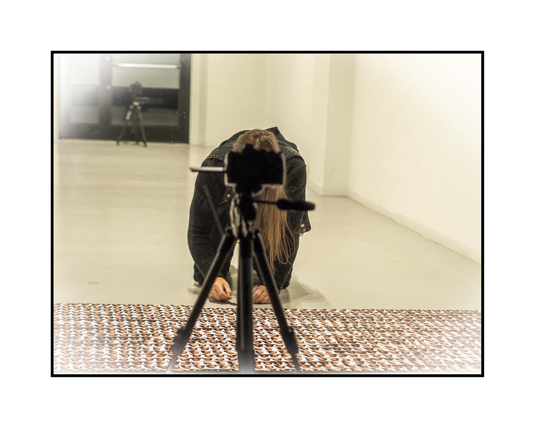 Il video della performance e le tracce dell’azione sono in esposizione in galleria assieme a una linea di fototessere, senza soluzione di continuità, che perimetra i muri interni della galleria.