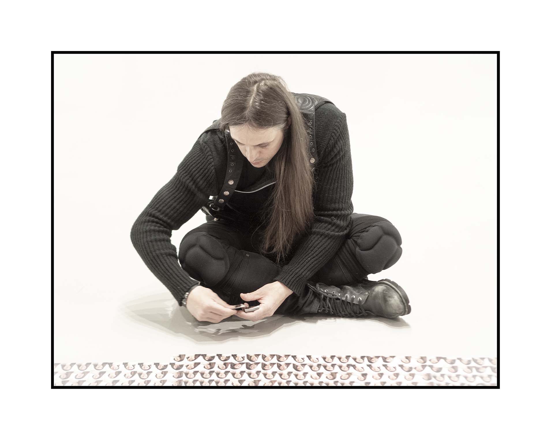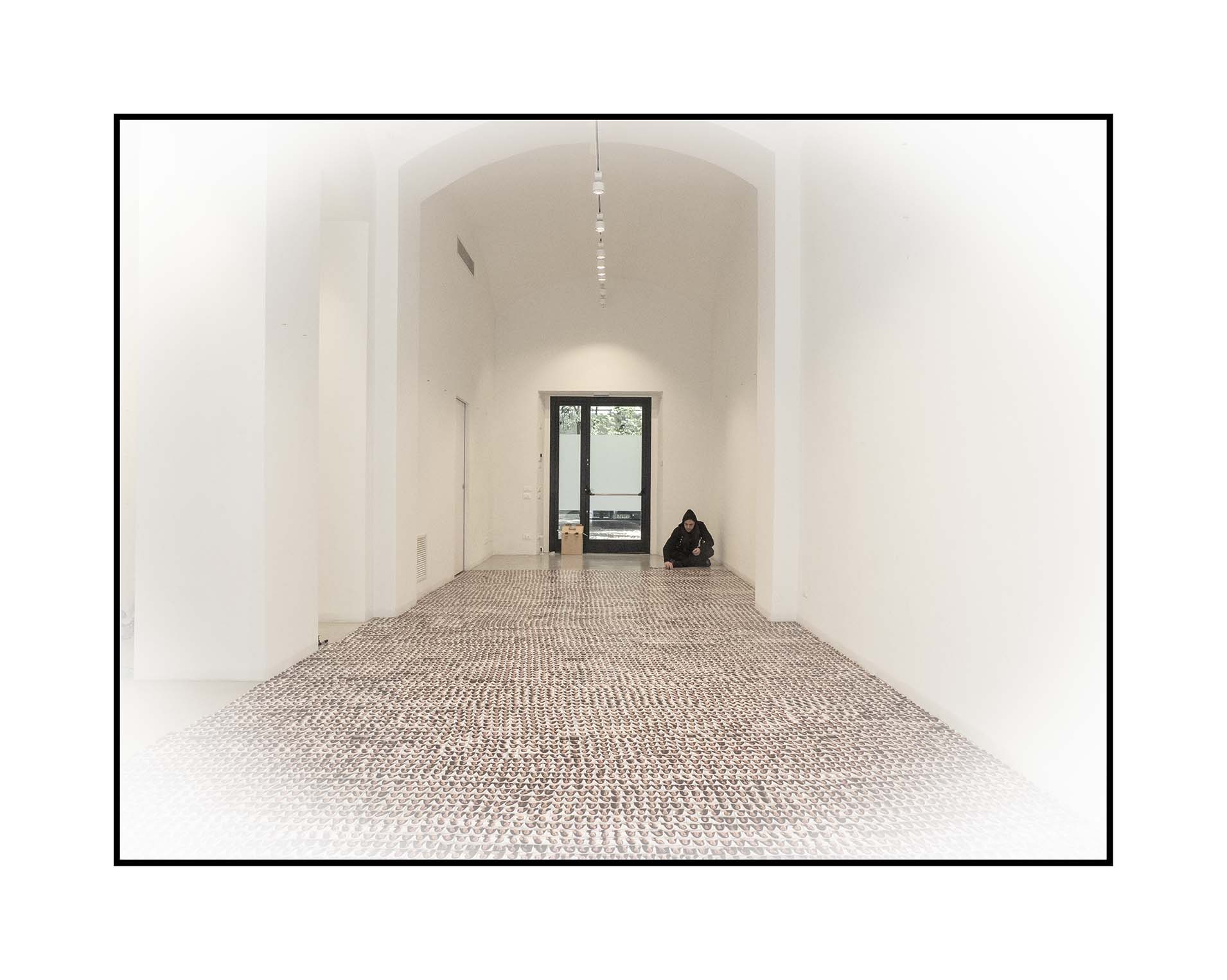 La seconda fase prevede la disposizione e l’allineamento a terra, sul pavimento della galleria Fabbrica Eos di Viale Pasubio, delle 28.000 fototessere. L’azione, che si svolge nell’arco temporale di 12 ore, dal tramonto all’alba, si concentra sulla celebrazione dell’EGO autocentrato, ripiegato su di sé come un Narciso chino sulle proprie ginocchia, intento a posare la propria immagine e a contemplarla, pago di sé stesso, egoista, solo, indifferente, incapace di relazionarsi con quanto accade all’esterno.