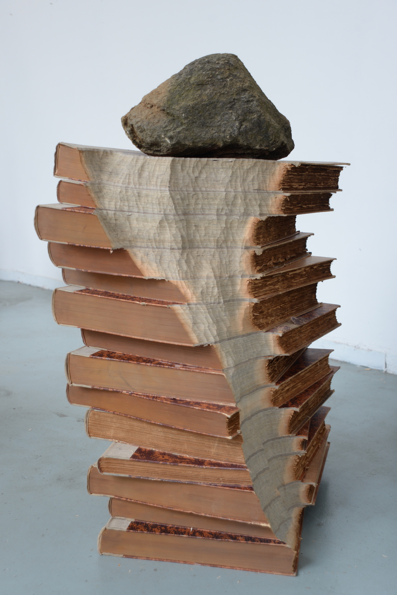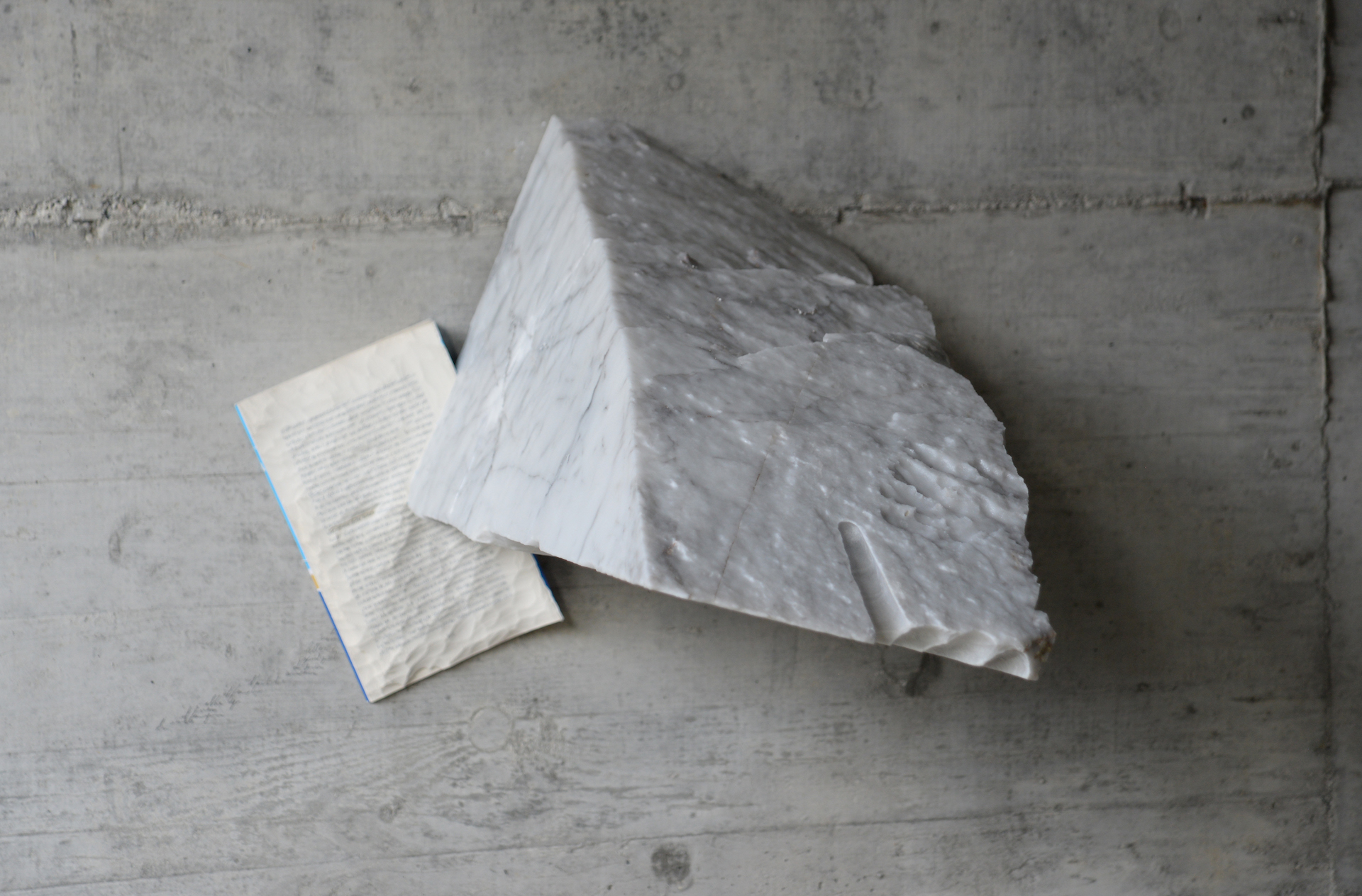 La mostra è un’esplorazione profonda delle intersezioni tra scultura, testo e memoria. L'elemento principale delle sculture di Marco Cordero è un libro, un libro vero, di cui l'artista si appropria, ma rielabora: scavato, bruciato, strappato alla sua funzione di libro. Nel suo lavoro, il libro diventa un organismo vivente, un assemblaggio di materie che, grazie alla loro combinazione, acquistano un assetto vitale. In questa mostra, Marco Cordero lega il destino dei suoi libri alla roccia, alla pietra e al marmo. Questa combinazione dà origine a ibridi sorprendenti: libri come rocce o rocce come libri. L'artista dispone questi ibridi in vari modi nello spazio della galleria: li sospende per ricostituire uno skyline, li posiziona sul pavimento, li combina anche, ad esempio, con una colonna di pietra che richiama uno degli elementi dell'architettura della galleria.