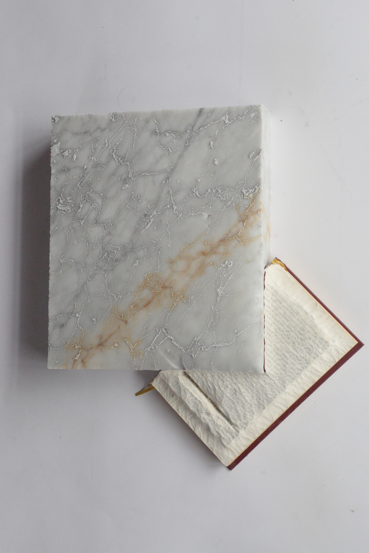 La mostra è un’esplorazione profonda delle intersezioni tra scultura, testo e memoria. L’elemento principale delle sculture di Marco Cordero è il libro, di cui l’artista si appropria, ma che rielabora. Marco Cordero lega il destino dei suoi libri alla roccia, alla pietra e al marmo.