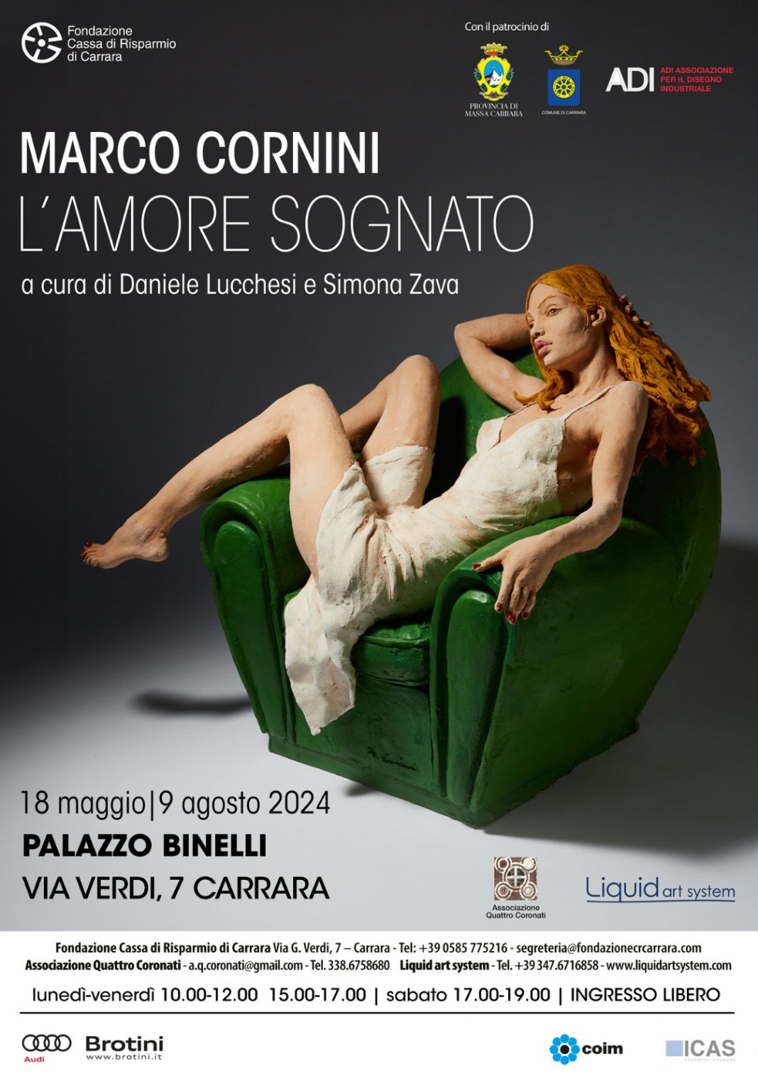 Sabato 18 maggio 2024, alle ore 17, s’inaugura a Carrara, nelle prestigiose sale di Palazzo Binelli – Fondazione Cassa di Risparmio di Carrara, la mostra di Marco Cornini L’amore sognato, a cura di Daniele Lucchesi e Simona Zava.