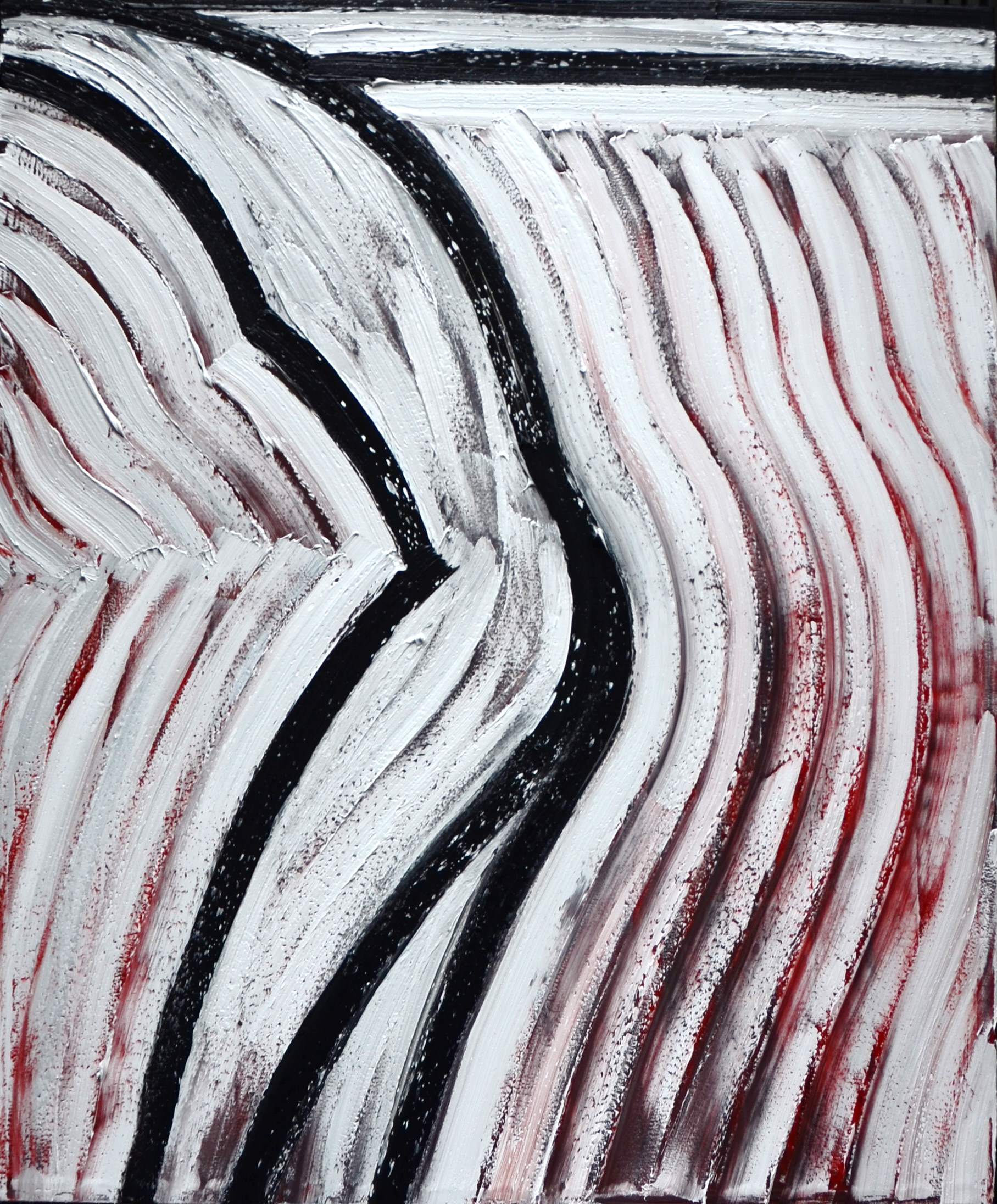 Gli antropologi riconoscono che l’Uomo lavora sul corpo creando un’estetica particolare legata alla cultura, così l’artista ha il compito di riformulare una tavolozza minima proprio partendo dall’esperienza fisica del movimento. Marco De Barbieri parte da una cultura del corpo che è pura dinamica della danza ed elabora un linguaggio nuovo che utilizza la parte per il tutto, come in una sorta di gigantesca sineddoche del pennello. Dalle opere che mantenevano la riconoscibilità del soggetto si passa ad una serie che mette l’accento sulle curve sbandando quasi verso l’Informale. Gli individui si muovono nello spazio duplicando se stessi in vibrazioni sequenziali. Sono potenzialmente riscrivibili nel senso che sono privi di una personalità, eppure le angolature imprimono forza a ciascuna posizione, spesso lasciando allo spettatore l’opera di ricostruzione, facendo sì che si debba immaginare il tutto. Le spigolosità creano una scrittura concreta che nasce e si definisce grazie al proprio significato diventando un abbozzo del suo significante. È una prova solida, che si rifà all’arte africana anche per il ritmo che l’artista imprime alla figurazione. Una decostruzione simile a quella messa in atto da Picasso nel suo periodo proto-cubista: le forme compatte delle “Demoiselles d’Avignon” non sono uno studio anatomico coerente, ma di una visione multifocale di un unico volume immerso in uno spazio a quattro dimensioni, in cui cioè si deve considerare anche il fattore temporale espresso da un’ipotetica musica che annulla la differenza tra i pieni e i vuoti, marcata dalla definizione della linea. È dunque su queste direttive che si genera una superficie diversa, graffiata di neri sul rosso e sul bianco. Una scelta difficile che si gioca sull’esaltazione del sentimento laddove questo si cancella nell’apparente neutralità dell’Io che in realtà si espande all’esterno in una ripetizione infinitesimale. La suddivisione è solo arbitraria, decisa a posteriori dalla sovrapposizione dei contorni come se ogni gesto rincorresse il precedente, in una successione che è espressione mentale piuttosto che ricerca estetica.