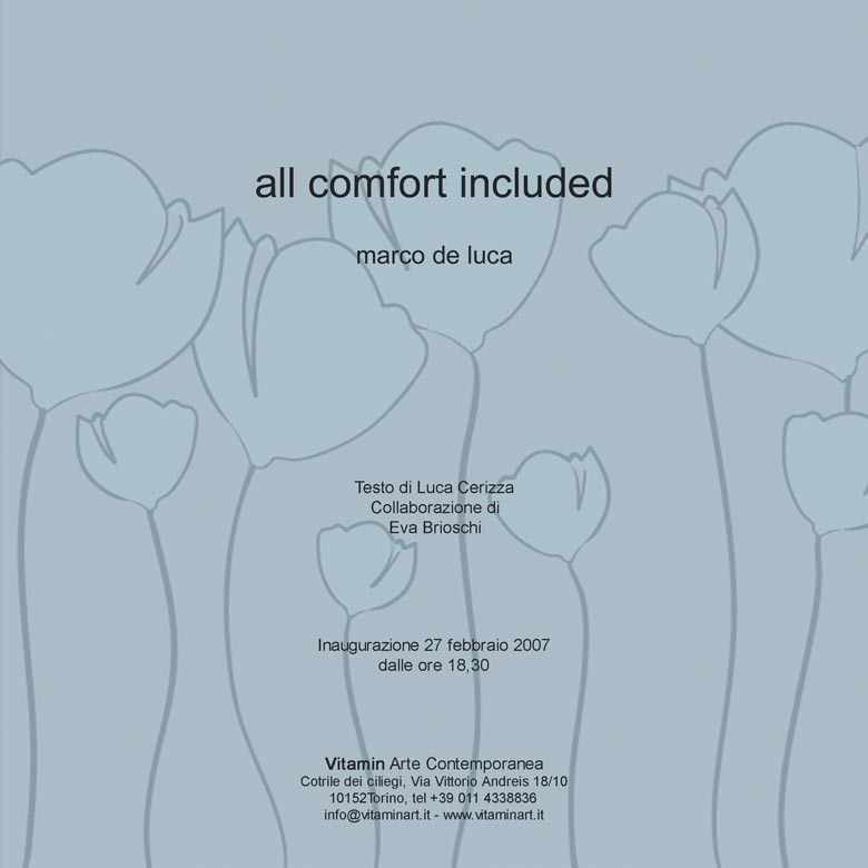 All comfort included è una formula commerciale che promette benessere e, con esso, una certa idea di felicità. L’espressione “included” e la sua allusione a un interno domestico appagante vale anche come sinonimo di chiusura, di un’autoreclusione necessaria per proteggere il dentro dal fuori, il sé dall’altro. Con questo progetto Marco De Luca sviluppa la sua ricerca sul rapporto tra il corpo – riferito sia all’esperienza singolare sia a quella della collettività - e l’ambiente, esplorando il tema dell’abitare alla luce di una politica dello spazio che rispecchia le contraddizioni della città contemporanea, così come il rapporto tra ideale e stereotipo. La diffusione di modelli abitativi con perimetri trasformati in frontiere da cui diventa difficile entrare quanto uscire, i conflitti di vicinato, l’insicurezza, e quindi la paura, sono le premesse di un insieme di lavori che Luca Cerizza ha scelto di accompagnare con un intervento critico in forma di narrazione dal quale emergono spunti di lettura e riflessione. Negli spazi della galleria il volume stilizzato di una piccola casa senza aperture e con le pareti decorate con illustrazioni floreali appare circondato da un’area luminescente di frammenti di vetro. Come una sorta di miraggio, di proiezione di un’ideale abitativo che ha le sue radici nell’infanzia, è una presenza al tempo stesso seduttiva e respingente, invalicabile. Un’ambivalenza rispecchiata nell’installazione a parete della scritta “all comfort included” che l’artista ha composto affiancando le incisioni su carta delle singole lettere realizzate con font diversi. L’effetto grafico, simile a quello impiegato per la stesura dei messaggi anonimi, introduce nella scansione invitante e rassicurante della formula commerciale un sottile elemento d’allarme: la combinazione di alcune lettere in rosso crea la parola “crime”. Come un brusio di fondo che si insinua sottotraccia a sovvertire l’ordine del linguaggio, a dirottare gesti e pensieri.