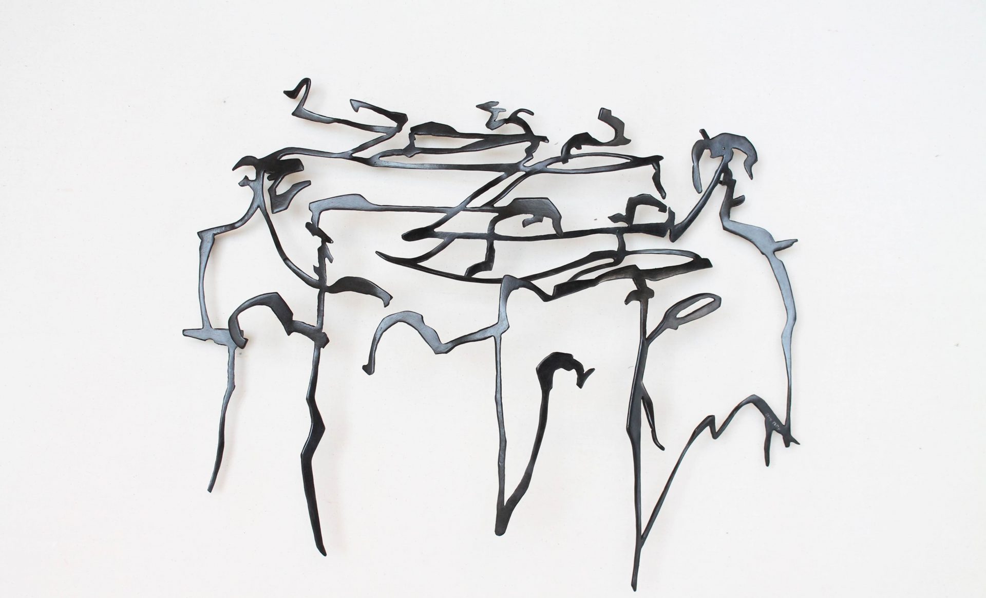 Nel corso della sua carriera artistica, senza mai abbandonare il disegno, Marco Di Piazza esplora la materia, prima la pietra e il bronzo, poi il ferro e l’acciaio, svuotandola progressivamente del suo “peso”, per approdare a una dimensione di leggerezza che è oggi cifra essenziale del suo fare arte, come l’artista stesso racconta: “Nei quindici anni in cui ho lavorato la pietra e il bronzo, continuando a disegnare, il tema della maternità e della coppia produceva figure solide e in quiete: c’erano già la danza e il movimento ma ambedue contenuti. Poi la liberazione in un certo senso dalla materia… A inizio degli anni 2000, sulla scia del disegno, che nel tracciare la figura umana era sempre stato scarno e immediato e adesso si faceva ancora più essenziale e dinamico, ho iniziato a realizzare sculture in acciaio che, nella composizione, facevano prevalere i vuoti sui pieni. Ecco da qui sorgere un’immediata e inevitabile ‘spiritualità’, non cercata con l’intenzione, ma incontrata e raggiunta. Una dimensione che nasceva da una fortunata e faticosa ricerca che mi fornì gli espedienti tecnici per realizzare sculture stabili e solide in ognuna delle loro nervature. Improvvisa si apriva tra le mie mani la possibilità di svuotare teste, arti e corpi realizzando opere capaci di risentire appieno della sensibilità e della gerarchia delle linee proprie ai disegni di origine”.