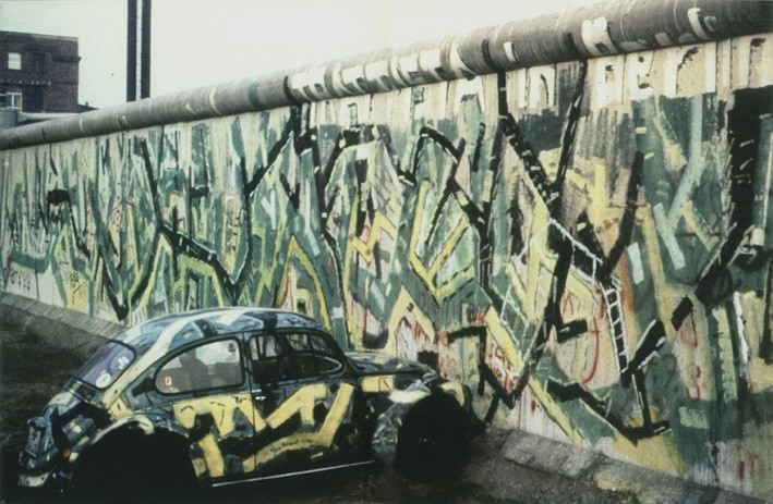Una delle azioni-installazioni più ambiziose di Fioramanti avveniva in faccia al Muro di Berlino, con una volkswagen i cui motivi pittorici che egli aveva già tracciato su di essa venivano riproposti su quaranta metri di Muro. Caricando d’energia segnica tanto la macchina che il Muro sembrava che questa fosse sul punto di frantumarlo. Con i graffiti dei suoi anni Fioramanti condivideva il gusto per una pittura che voleva uscire dal ghetto del quadro ed urlare in faccia ad un pubblico che non voleva esser più quello delle gallerie e dei musei. Chiaramente vi era simile anche l’energia astratta dei segni o sarebbe meglio dire dei “geroglifici”.(Enrico Mascelloni)