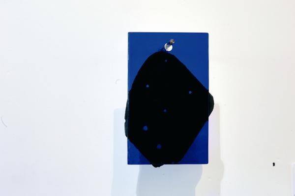 nuovo al vetro, ma in questo caso lo ha eletto a protagonista di questi piccoli, ma fascinosissimi lavori. Il vetro , di notevole spessore, e sospeso a un perno di metallo ( quindi potenzialmente mobile), è usato al fine di sfruttare la sua intensa luminosità, le rifrazioni della luce, di un blu profondo e abissale, che esso determina, rapportate all’opacità delle forme irregolari dei pezzi di ardesia scura-- posti sopra la superficie o ad essa sottostanti -- alle loro diverse declinazioni cromatiche (non indenni da tentazioni pittoriche), crea un dialogo formale ed estetico di straordinaria seduzione emotiva e poetica. Mentre il vetro di per sé è un materiale che sembra nascere dal mare e vivere nella luce—in molti casi le frontiere tra luce-simbolo e luce-metafora rimangono sfrangiate, e sono forse un primo aspetto di un mondo informale-- la pietra delle nostre montagne ha bisogno dell’intervento dell’artista per raggiungere quella forma priva di fisicità, che in questo lavoro nasce dall’accostamento, o meglio dall’ibridazione, con la materia trasparente. Ilcolore del vetro, blu intenso come un cielo tropicale o le profondità del mare più