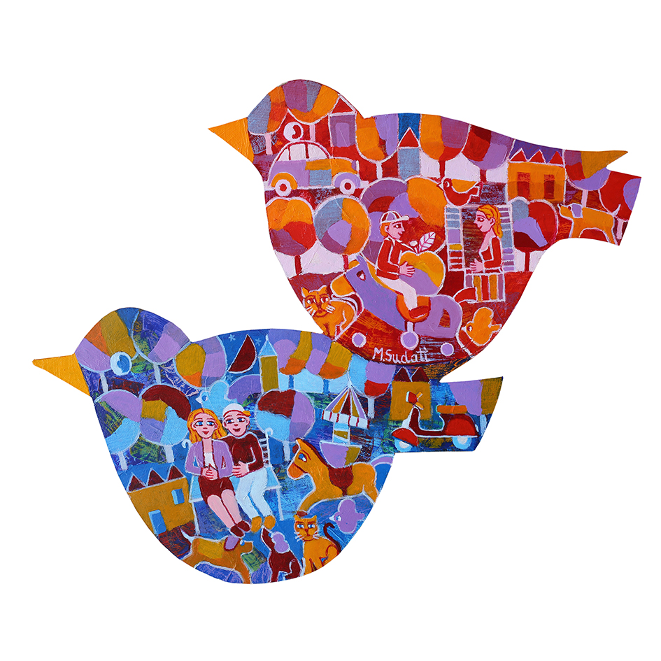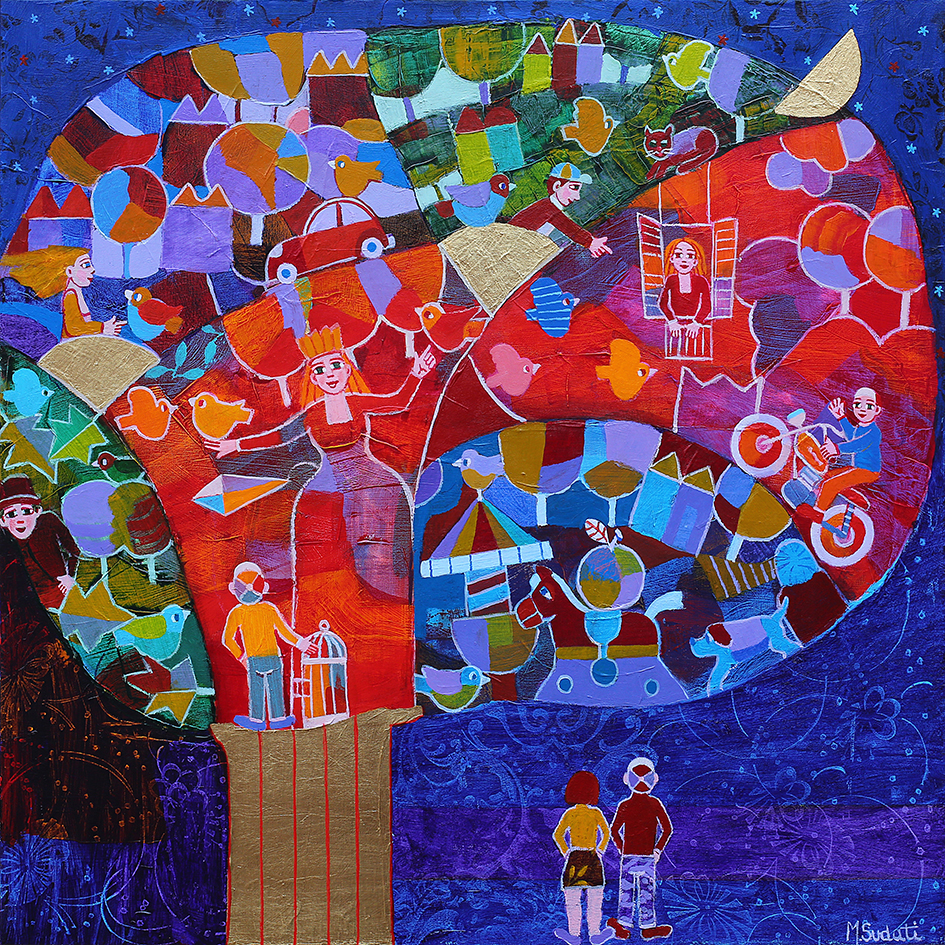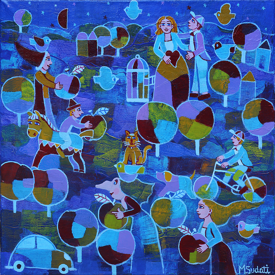 “Le opere di Marco Geremia Sudati si configurano come costruzioni fenomeniche funanboliche, all’interno della quali prende vita un caleidoscopio di forme, oggetti, situazioni fantasiose e tratte dalla vita quotidiana che si affastellano in un caotico dinamismo dove la dimensione temporale si annulla sfumando in un atmosfera fiabesca di surrealtà, di realtà trasognata.