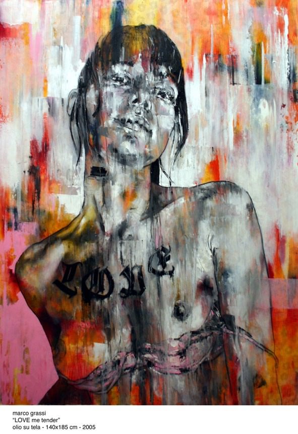 Nella personale di San Pietro in Atrio i lavori proposti sono l’evoluzione di un percorso intrapreso dall’artista negli ultimi anni. Soggetti di Love me tender sono giovani donne, modelle aggressive negli sguardi e nelle pose, quasi barbariche nella loro spontaneità. La bellezza dei loro corpi, scolpiti sulla tela in bianco e nero, è la vera protagonista della recente serie, realizzata da Marco Grassi. Frammenti di corpi provocanti e statuari, ma anche languidi e ammiccanti, svelano, in un gioco complice con lo spettatore, sempre lo stesso tatuaggio “Love”, una sorta di messaggio sussurrato, ripetutamente scritto a caratteri gotici in diversi punti del loro corpo: sotto una canottiera rosa, su un braccio, sulla schiena, sul décolleté lasciato maliziosamente scoperto, su un polpaccio spogliato da un paio di jeans. Valchirie strizzate in magliette aderenti o nascoste da carismatici occhiali da sole, abbandonano un piacevole voyeurismo preferendo provocare lo spettatore, inducendolo all’azione.