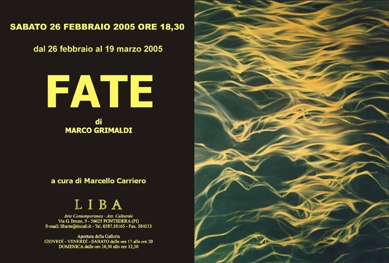 Grimaldi è un giovane artista lombardo che lavora su una pittura di liquida mobilità si afferma nella scena milanese con un suo proprio, rigoroso percorso. Le opere che la galleria LIBA esporrà fino al 18 marzo sono delle suggestive ed evanescenti “presenze” fluttuanti nel buio della tela. Il catalogo in galleria è un vero e proprio saggio sulla pittura di Marcello Carriero. La mostra “FATE” di Marco Grimaldi è patrocinata dal Comune di Pontedera.