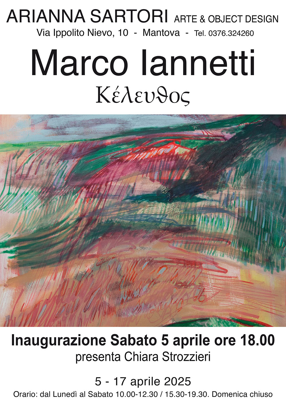 La Galleria Arianna Sartori di Mantova, nella sala di via Ippolito Nievo 10, presenta la prima mostra personale dell’Artista Marco Iannetti intitolata “Κέλευϑος” (percorso).