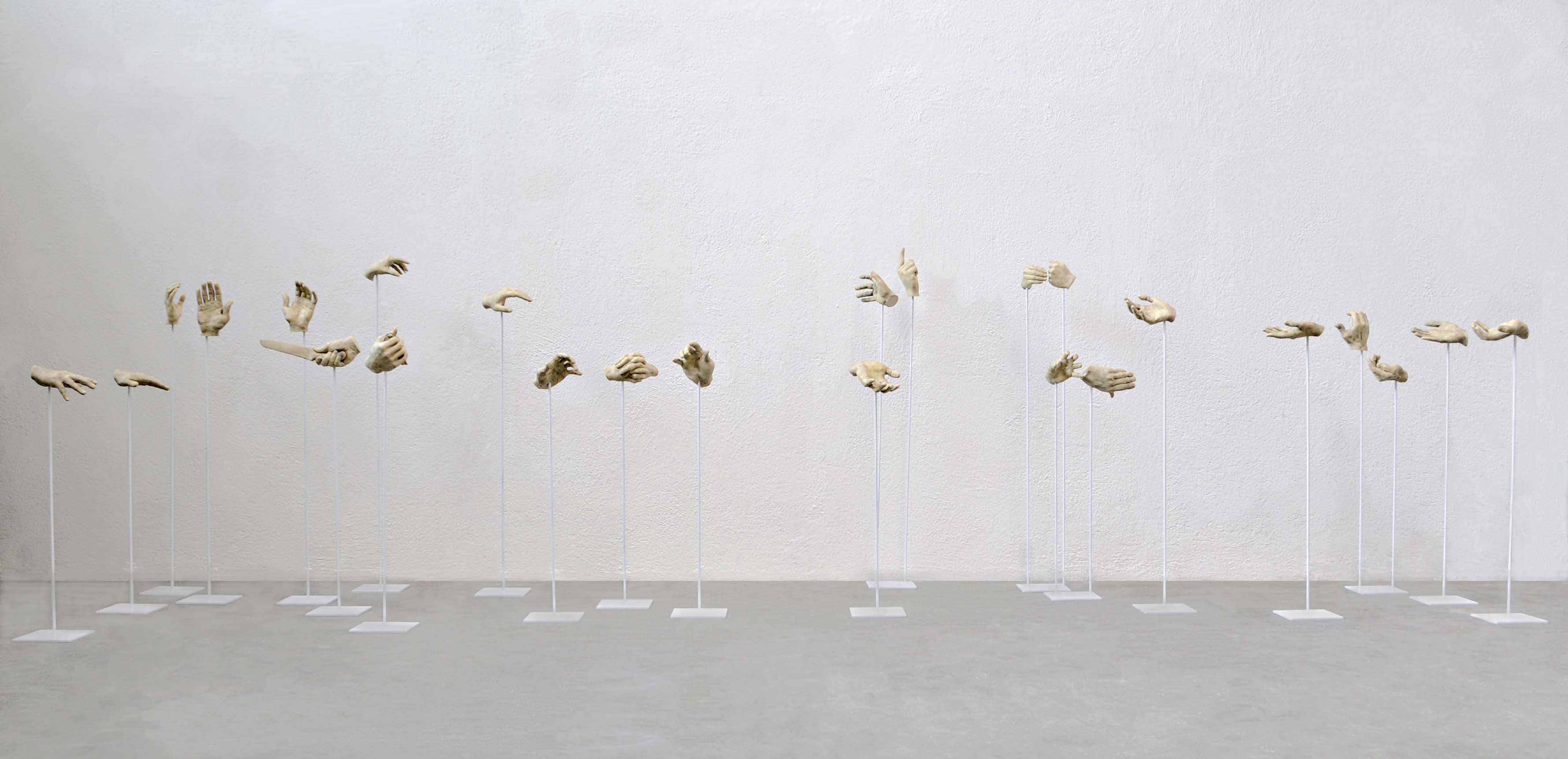 Con questo lavoro ho voluto richiamare esplicitamente il celebre capolavoro di Leonardo. Nel Cenacolo infatti l’artista si è concentrato sul ‘luogo-momento’ preciso in cui Cristo, posizionato al centro delle linee prospettiche, annuncia ai suoi discepoli: «In verità vi dico, uno di voi mi tradirà» («Amen dico vobis, quia unus vestrum me traditurus est» Mt 26,21). Di conseguenza, quasi tutti i discepoli, con i più diversi gesti e reazioni (ethos e pathos, riprendendo Aristotele), esprimono il loro sbigottimento e spavento per l’annuncio del tradimento. Per la prima volta nella rappresentazione post-medioevale dell’Ultima Cena Giuda non è seduto davanti, bensì dietro il tavolo. Altre sono le peculiarità che hanno attratto la mia attenzione: innanzitutto è uno dei pochissimi dipinti di questo periodo (1495-1497 ca) che rappresenti in modo inequivocabile il momento dell’annuncio, ovvero la reazione a esso; inoltre Leonardo dinamizza l’evento sia mediante la divisione dei discepoli in quattro gruppi di figure diversamente atteggiati, sia mediante la resa accuratamente calcolata dei gesti di ciascun personaggio. È proprio quest’ultimo aspetto che mi ha dato lo stimolo per la realizzazione del progetto: realizzare attraverso 25 calchi in resina delle mani dei vari personaggi il luogo e il momento dell’annuncio del tradimento; ogni coppia di mani è una fedele riproduzione del capolavoro di Leonardo, tutti i personaggi riprodotti sono attinenti per età e caratteristiche all’originale, tutte le coppie di mani sono calchi di persone diverse (tranne per le mani di Cristo e Giuda che sono tutte e quattro le mie). Le sculture sono poi sostenute da delle piccole basi in ferro e disposte in un’installazione tridimensionale di dimensioni ambientali. Il titolo, L’Argomento del terzo uomo, si rifà alla filosofia aristotelica dove è uno dei principali argomenti usati dal filosofo greco nella critica alla teoria delle idee di Platone. È infatti a partire dalla negazione della celebre dottrina del suo maestro che Aristotele fondò le basi della sua metafisica. L’Argomento del terzo uomo è la messa in scena della notizia che scorre tra i personaggi, diversamente rappresentati, o meglio sorpresi, in atteggiamenti rivelatori dei loro diversi caratteri psicologici e delle rispettive individualità (è noto l’interesse di Leonardo per le reazioni esteriori e fisiche delle passioni e dei moti dell’animo); diversamente coinvolti e combattuti tra il libero sfogo passionale suscitato dall’annuncio, e il rigore della responsabilità e del ruolo rivestito, in un delicato, e allertato confronto tra ethos e pathos, tra destino e libero arbitrio.