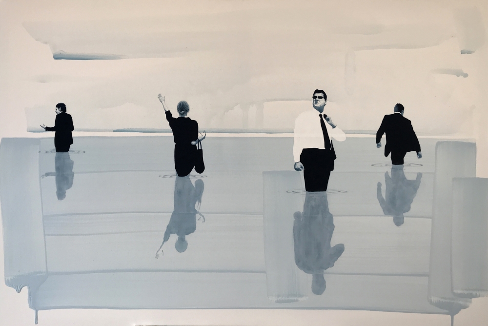 “Quello che Marco Lampis raffigura in questo suo ciclo di opere recenti - riporta il curatore Francesco Poli - è la visione di una realtà sospesa in una dimensione spaziale e temporale indeterminata, incerta, silenziosa, senza confini definiti; senza valenze drammatiche ma melanconica e vuota di tensioni vitali [...]. Per alludere alla fluttuante e “liquida” società contemporanea (ispirandosi anche al sociologo Bauman) il pittore ha rappresentato, in vari casi, i personaggi con i piedi e le gambe immerse in una superficie di acqua, cosa che aggiunge delle valenze bizzarramente immaginifiche alle composizioni”.
