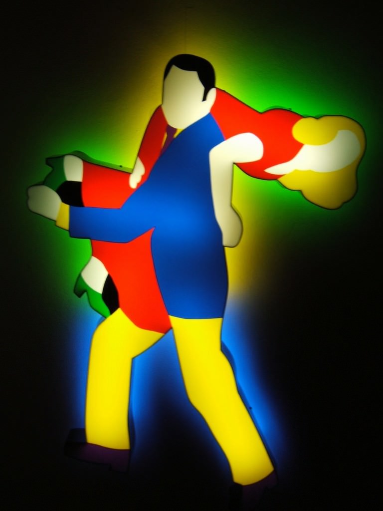 Ecco che come un “ maestro semiologo” l’artista Marco Lodola riesce a creare con i suoi lavori una coreografica simbologia cromatica figurativa data da un insieme di magiche figure chiuse all’interno di scatole luminose, di tele bianche o di semplici carte ondulate.