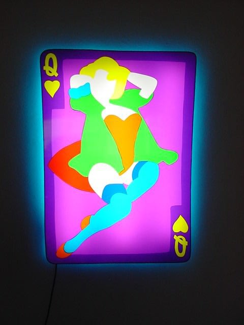 Il voyeurismo, l’arte e la gioia sono qui “soggetti” d’avanspettacolo percorsi dall’elettricità che dona vita a fantastiche creature di plastica in fermo-immagine, agli ammiccamenti seduttivi di prosperose pin-up in pose provocanti, alle leggerezza delle ballerine en attitude e ai loro tulle fluorescenti, ai volti senza espressione da sfidare con il potere della fantasia. Opere che decorano e reinventano il nostro quotidiano annullando la distanza fra l’arte e la sua applicazione.