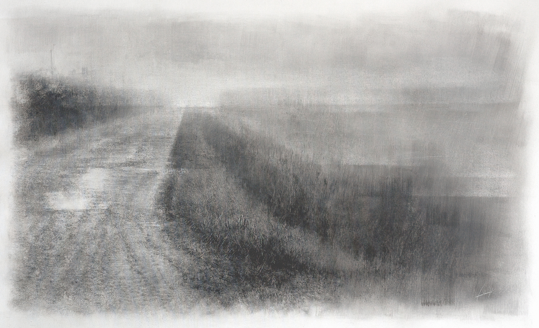 Marco Longo è un pittore raffinato la cui opera traduce in maniera personale e contemporanea una tradizione che deriva dalla scuola dei suoi maestri dell’Accademia Albertina: Sergio Saroni e Giorgio Avigdor. La mostra “Orizzonti. Le imperfezioni dell’anima” propone una serie di opere che hanno come soggetto paesaggi naturalistici, squarci di periferie velati da una sottile atmosfera uggiosa, quasi malinconica. I suoi quadri coinvolgono attivamente lo spettatore e lo invitano ad un’osservazione attenta. Da lontano, infatti, appaiono come scene indefinite, toni di grigi e chiaroscuri, che vanno a delinearsi a mano a mano che l’osservatore gli si avvicina. Più si rimane a contemplarli più si viene rapiti da quelle atmosfere, come se con l’immaginazione si potesse entrare direttamente all’interno di quei paesaggi onirici.