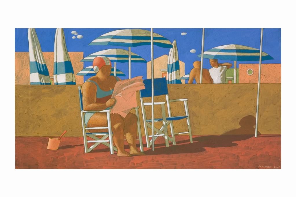 La Versilia è la protagonista indiscussa in queste sue opere più recenti di Marco Manzella, dove le rocce dei monti si specchiano nel mare e dove le spiagge arancio si alternano con verdi pinete. Bagnanti, bambini ed energici tuffatori occupano il palcoscenico fatto dal paesaggio. La figura umana è l’elemento su cui il pittore centra la sua attenzione.