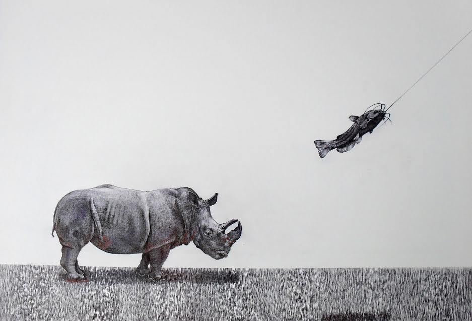 Il segno fitto, fino e aguzzo, preciso e deciso, della penna a biro di Marco Minotti va a scolpire metaforicamente sulla tela corpi di animali mitologici, orwelliani, intrisi di letteratura e storia, antichi, ancestrali, appartenenti ad un immaginario popolar-surrealista, iperrealista