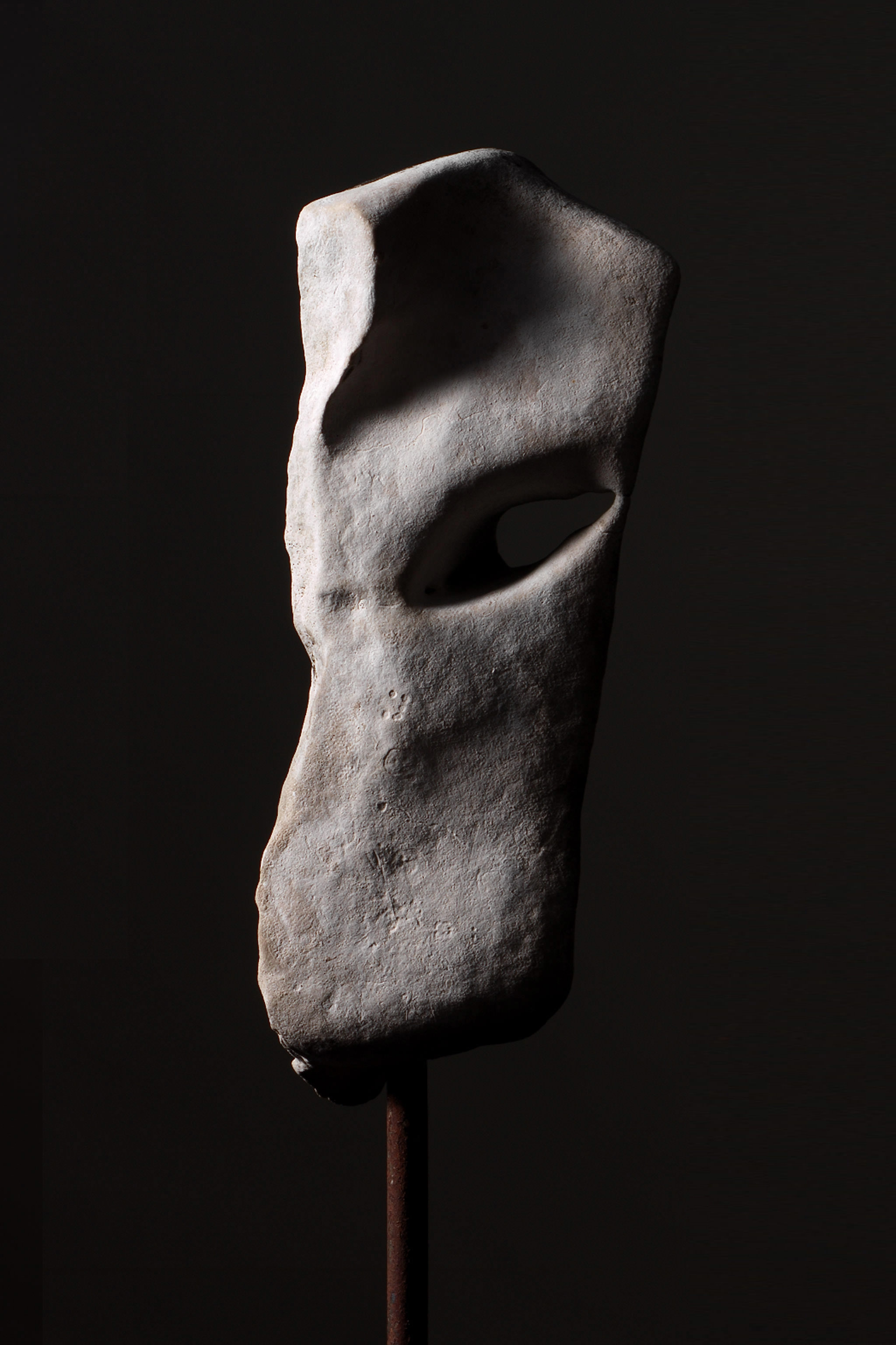 Silenti personaggi e figurazioni astrali navigano come asceti in una dimensione parallela, creata ad hoc per investigare nei segreti della creazione. L’orizzonte della percezione si allarga nel teatro spirituale di Mizar e lo spazio espositivo si fa tempio del religioso concepire dell’artista. Non ci sono accademie o movimenti artistici a cui rendere conto, la genesi della sua opera si fonda su una scuola molto più antica: la Natura. Quasi come un suo servitore questi si abbandona nelle mani della “madre”, lasciandosi guidare nel riconoscimento finale dell’opera. L’assemblaggio di pietre, tronchi, ossa animali, muta l’iniziale visione razionale degli oggetti, trasformandola in creazione. E’ il cammino che da forza al processo creativo: un cammino per boschi, valli e monti, dove le pietre si rivelano con le proprie sfaccettature all’artista, sussurrandogli la loro evoluzione. Un cammino che diviene mistico e che sancisce la definitiva coesione tra uomo e opera d’arte. Elegante lavoratore del legno, Marco abbraccia le sue muse taciturne con idee dalle radici ben salde, dando vita ad esemplari che calamitano l’attenzione dell’osservatore. Asal e Cintura di Orione rappresentano il perfetto equilibrio tra mondo e universo, dove i materiali forniti dalla Terra non impediscono alle opere di farsi specchio di qualcosa di molto più lontano e intangibile. Eppure «il cielo, il cielo è un ditale per cucire» (Paul Eluard), punto di origine e infinito, luogo dove si cela il credo di Mizar. Un volume non codificabile e non inscrivibile abbraccia e modella le opere, una genesi poetica che trae radici dalla silenziosa osservazione delle immensità. Il Concepimento e La morte si inseriscono così in questo percorso spirituale, incontrando i guardiani dell’anima dello scultore (l’angelo Mal’akh e il Guerriero) e ponendo Cefa (Pietro) come custode principe del mistero: realizzata con blocchi distinti di roccia, a figurare con la pietra non solo il nome, ma anche la fermezza di colui che acquisì il privilegio di monitorare le porte del Paradiso. La riflessione si fa massima davanti a Cristo, qua presentato in tre vesti diverse. Una tripla crocifissione dove l’unico sacrificato è Cristo stesso, punto nodale della lettura tematica introspettiva che ha generato le opere dell’artista. Spiritualità, Natura, Ascolto, sono le porte che Marco Bini ha aperto per rivelarsi.